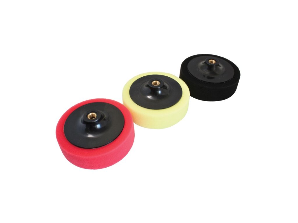 Huby – kotúče na leštenie karosérií áut a motoriek, priemer 8 cm, rôzne tvrdosti, úchyt do skľučovadla vŕtačky alebo leštičky M14x2, súprava 4 diely – SATRA S-3PS6