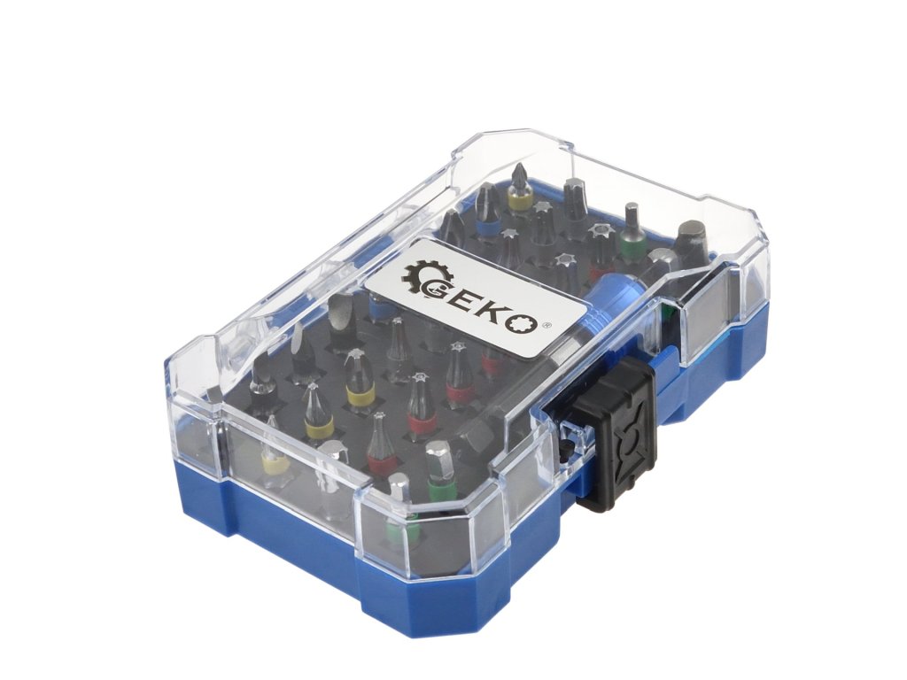 Súprava skrutkovačových magnetických bitov rôznych profilov s magnetickým držiakom, farebne odlíšené, 32 dielov v plastovej kazetke – GEKO G30064