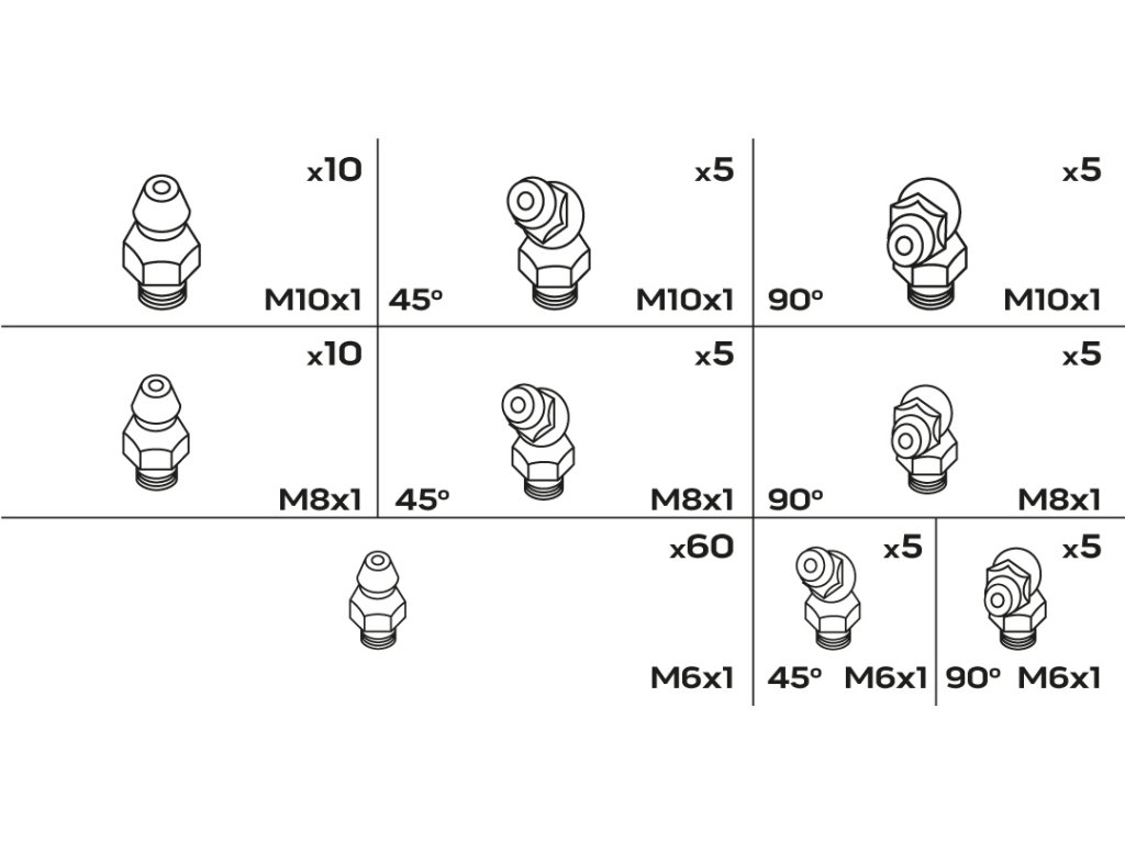 Sada mazacích vsuviek je určená na nanášanie maziva, zvyčajne tuku alebo oleja, na rôzne časti strojov. Používajú sa predovšetkým v priemyselných a automobilových aplikáciách, kde je pravidelné mazanie kľúčom k zníženiu trenia, opotrebovania a prevencii korózie.
