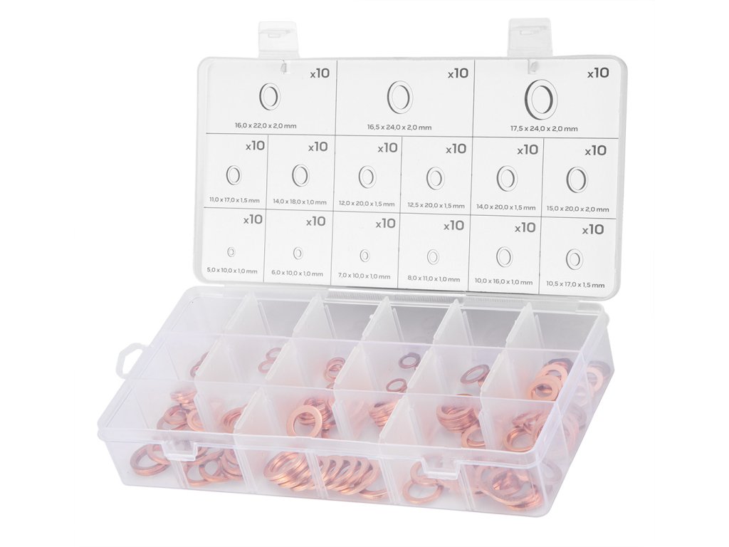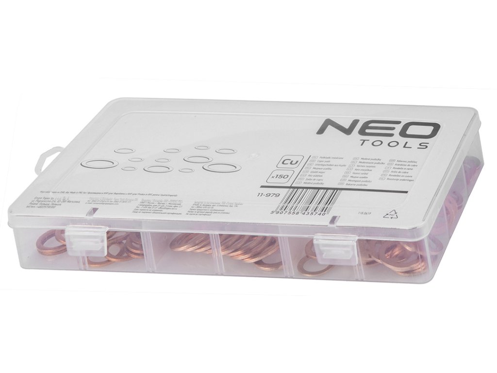 Medené podložky, 5-18 mm, sada 150 kusov, v plastovej škatuľke - NEO tools 11-979.