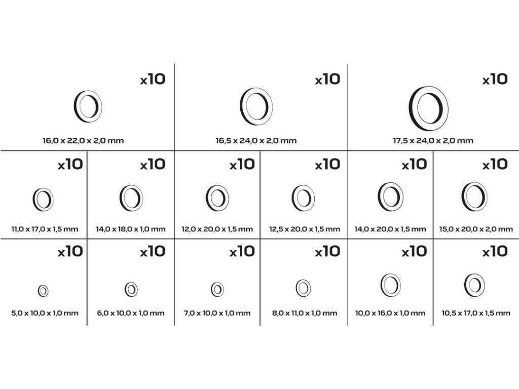 10 x (5x10x1 mm), 10 x (6x10x1 mm), 10 x (7x10x1 mm), 10 x (8x11x1 mm), 10 x (10x16x1 mm), 10 x (10,5x17x1,5 mm), 10 x (14x18x1 mm), 10 x (12x20x1,5 mm), 10 x (12x20x1,5 mm), 10 x (12,5x20x1,5 mm), 10 x (14x20x1 mm), 10 x (14x20x1 mm).5 mm), 10 x (15x20x2 mm), 10 x (16x20x2 mm), 10 x (16,5x24x2 mm), 10 x (17,5x24x2 mm)