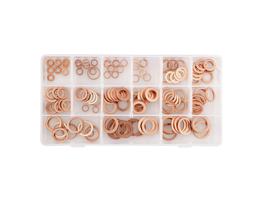 Sada medených podložiek je vhodná na použitie pri upevňovacích a tesniacich aplikáciách. Podložky sú vyrobené z medi alebo zliatiny medi a dodávajú sa v rôznych tvaroch a veľkostiach.