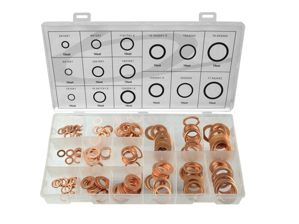 Sada medených podložiek 15 najbežnejších rozmerov po 10ks, všetko v praktickej plastovej krabičke.