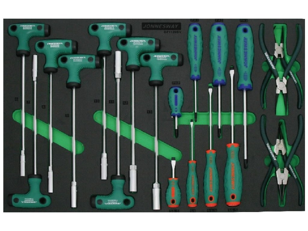 Všetko je v profesionálnej kvalite a zabalené v praktickom zakladači. Každá súčasť súpravy v nej má svoje miesto a navyše máte prehľad, či niečo nechýba. Sadu (modul) možno využiť ako vybavenie pre náraďové dielenské vozíky značky JONNESWAY.