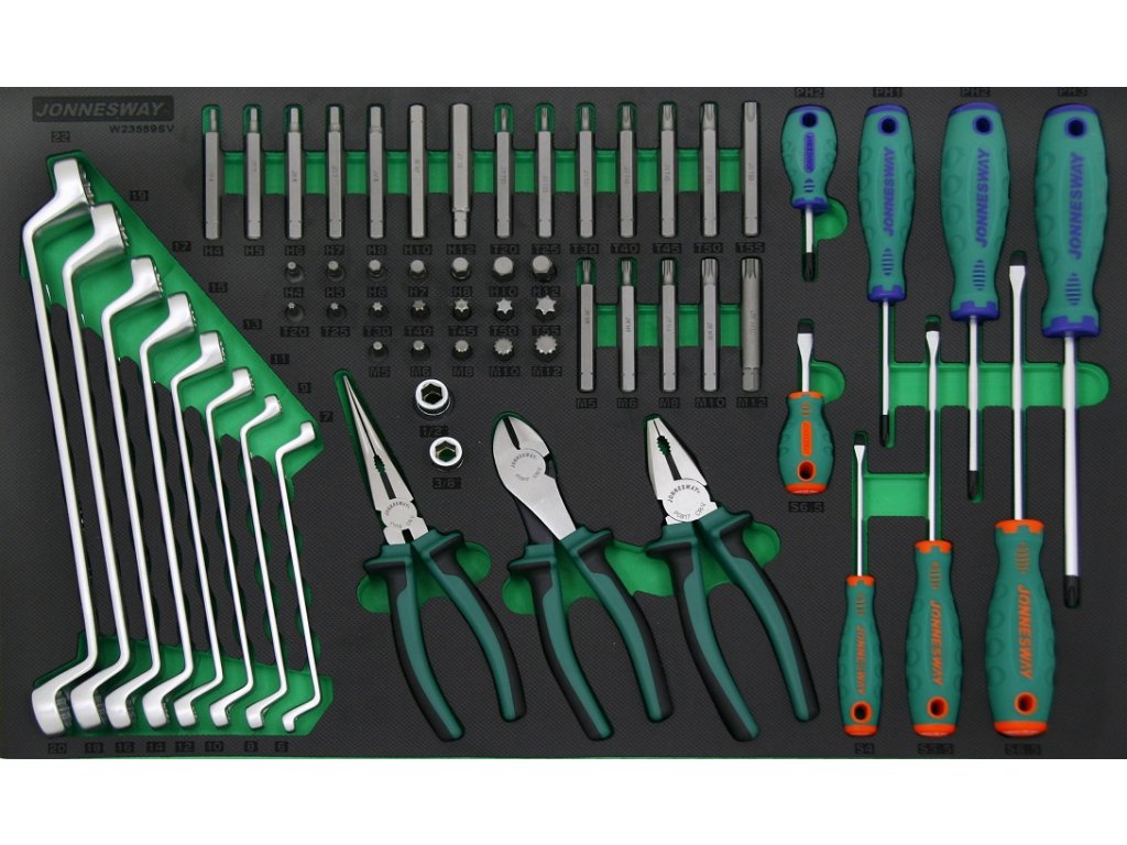 Všetko je v profesionálnej kvalite a zabalené v praktickom zakladači. Každá súčasť súpravy v nej má svoje miesto a navyše máte prehľad, či niečo nechýba. Sadu (modul) možno využiť ako vybavenie pre náraďové dielenské vozíky značky JONNESWAY.