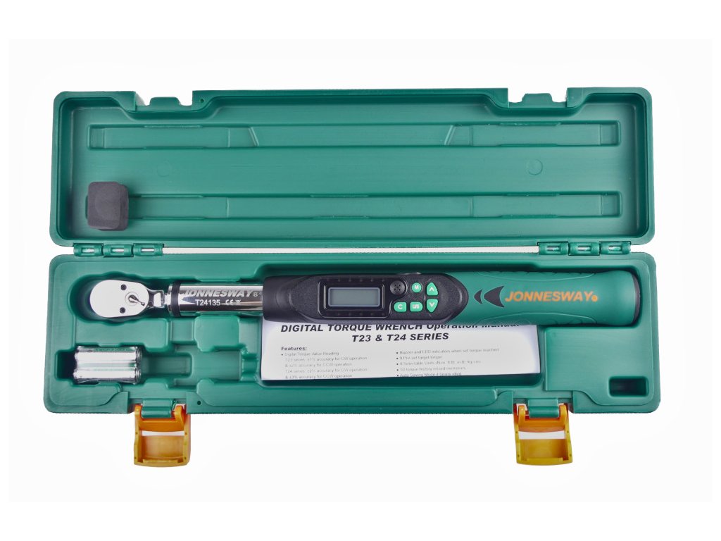 Presný , digitálny momentový kľúč JONNESWAY T24135 , štvorhran 3/8 “, rozsah 6,8 – 135 Nm , dodávaný v plastovom kufríku.