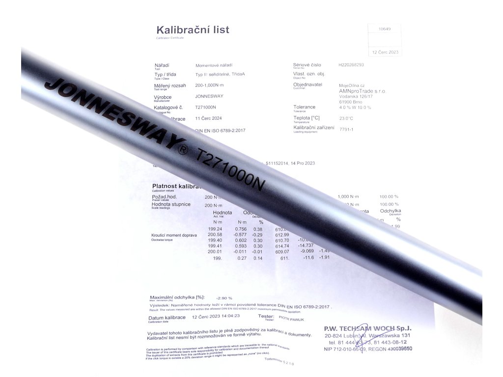 Každý kľúč je vyskúšaný a certifikovaný podľa DIN-ISO 6789. Kalibračný certifikát je dodávaný v češtine.