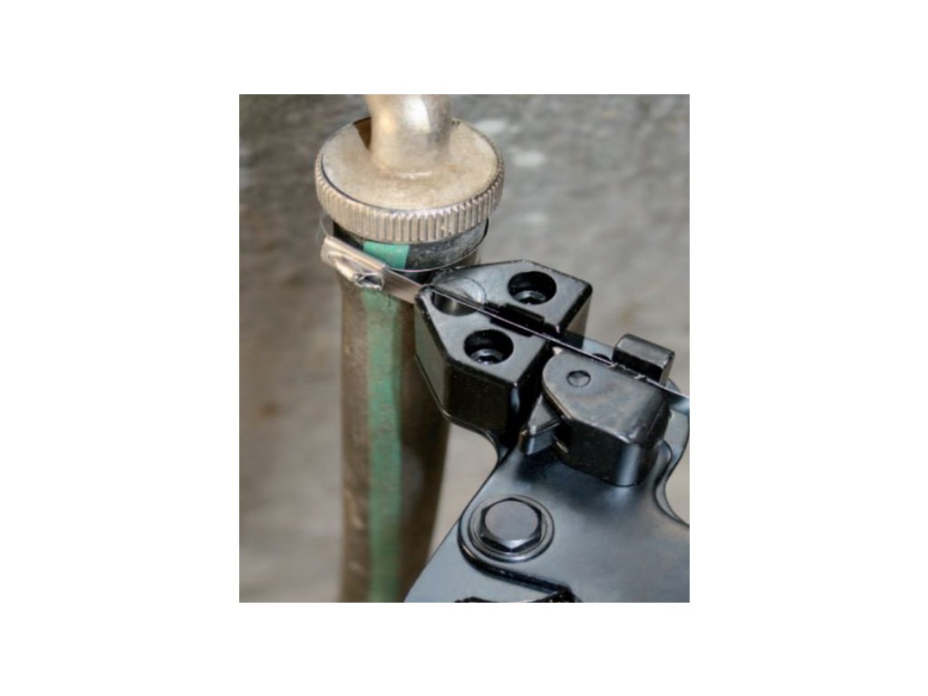 Montážny nástroj so špeciálne tvarovanými čeľusťami pre manipuláciu - stiahnutie (upevnenie) a úpravu dĺžky (napr. Odštiepeniu prebytočných koncov) sa sťahovacími pásmi z nerezovej ocele rôznych rozmerov.