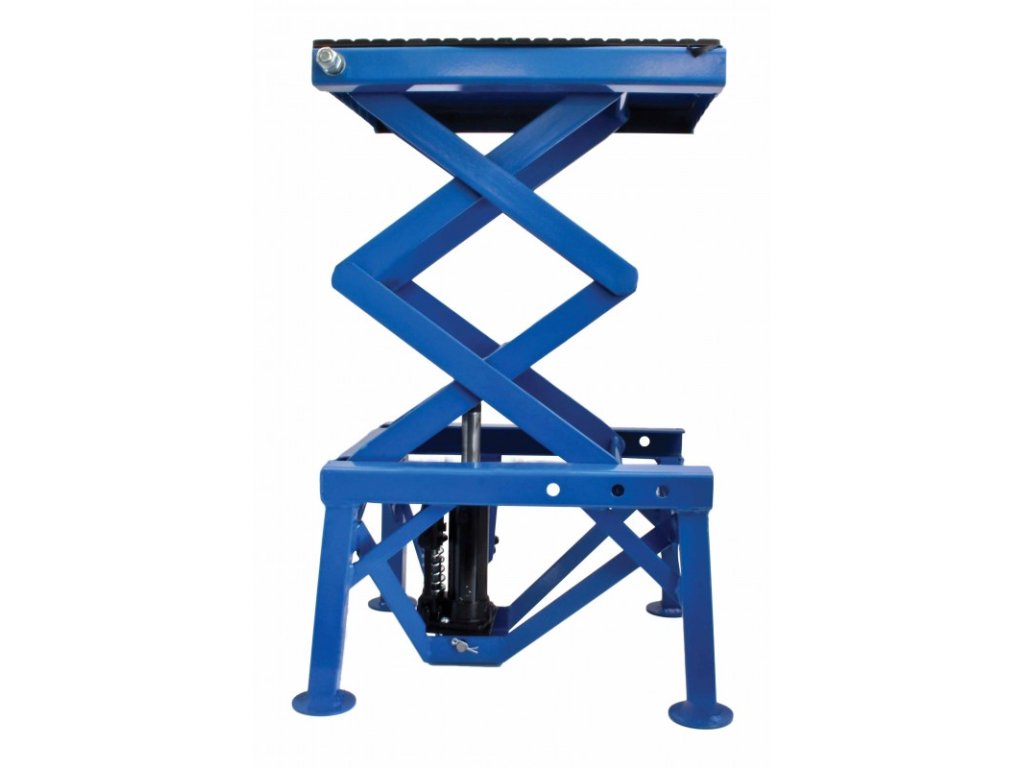 Praktický hever pre údržbu a opravy motocyklov. Vďaka širokej pracovnej ploche 410 x 350 mm je servisovaný stroj stabilný, výšku možno pre pohodlie mechanika nastaviť do 4 úrovní. Ovládanie sa vykonáva pomocou pedálu, takže ruky obsluhy môžu zostať voľné.