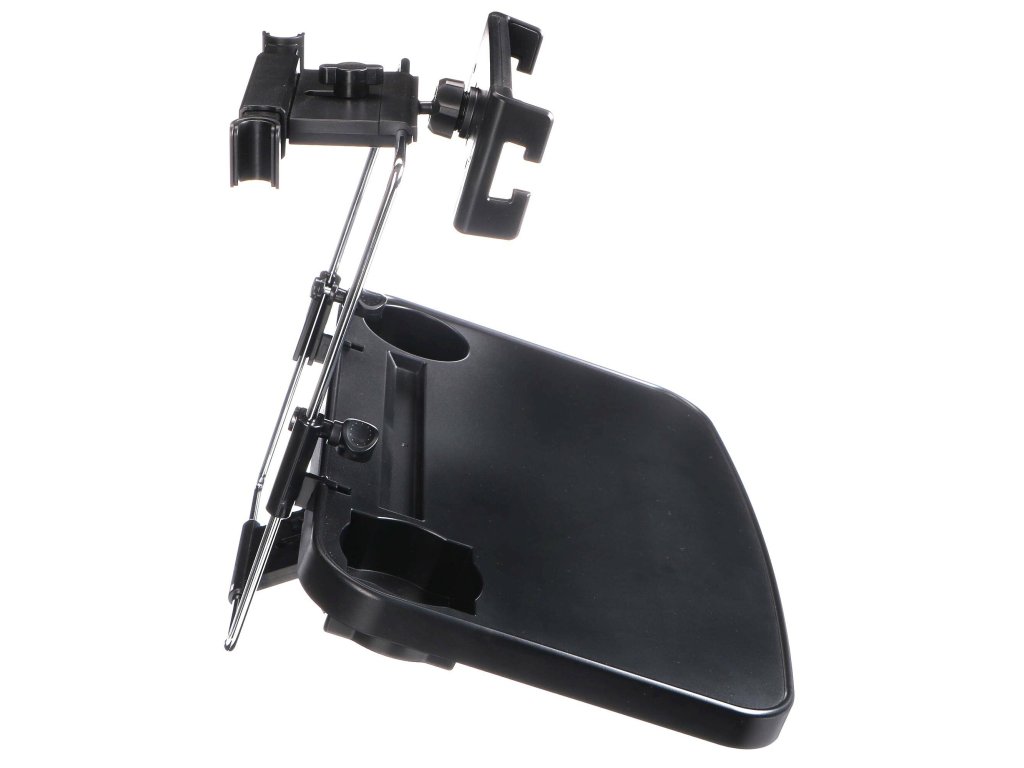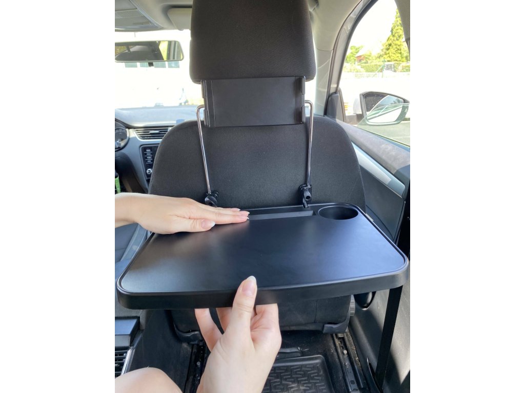 Multifunkčný stolík do auta vybavený držiakom na telefón možno ľahko upevniť medzi tyče opierky hlavy a jeho výšku a sklon možno nastaviť pomocou nastavovacích koliesok.