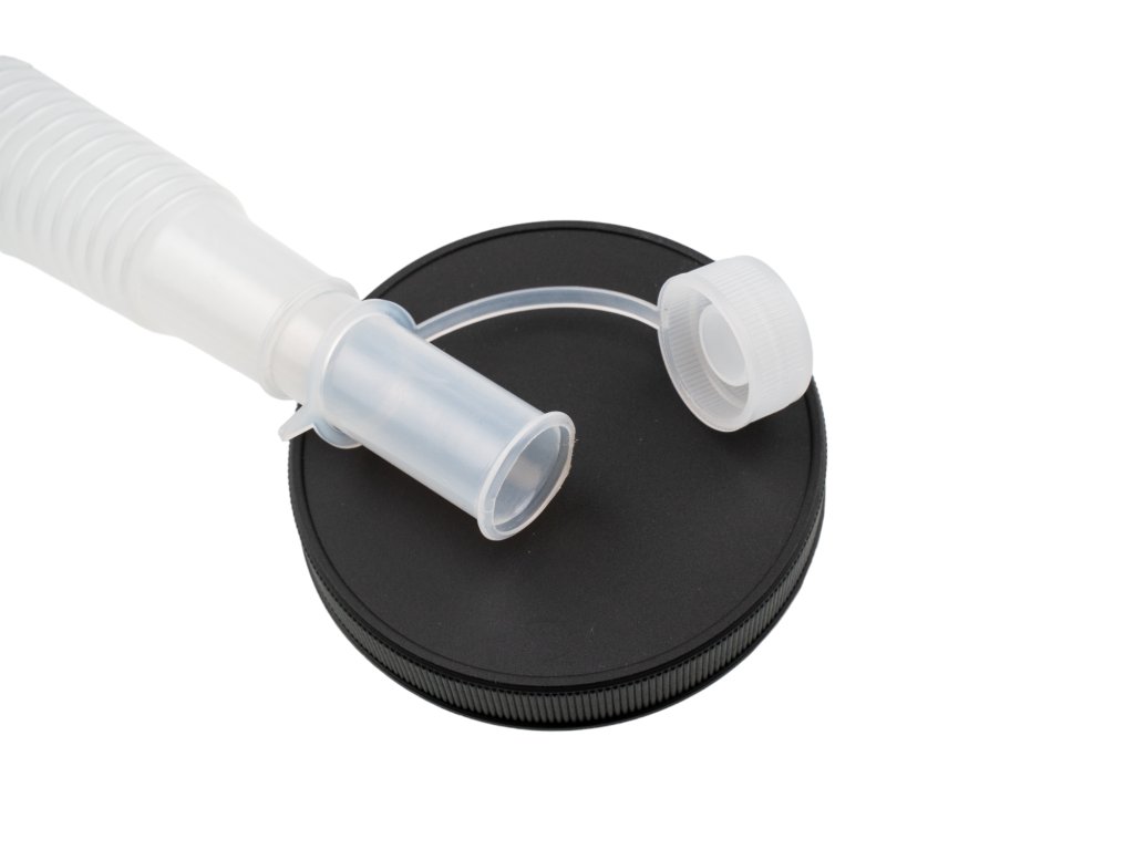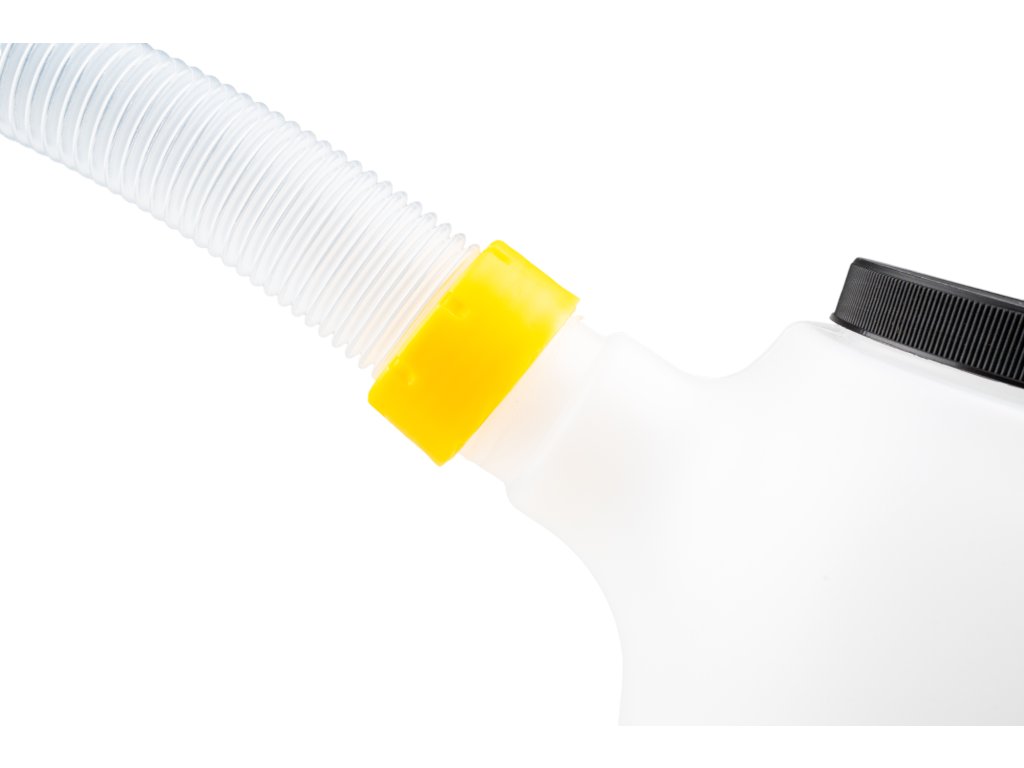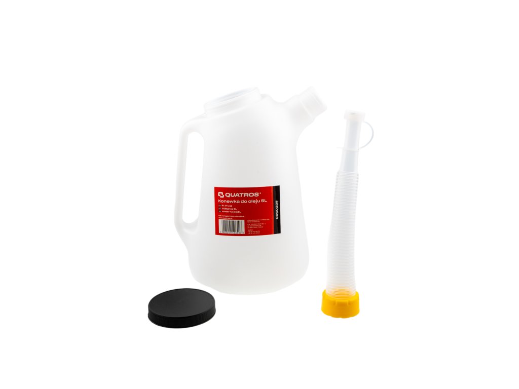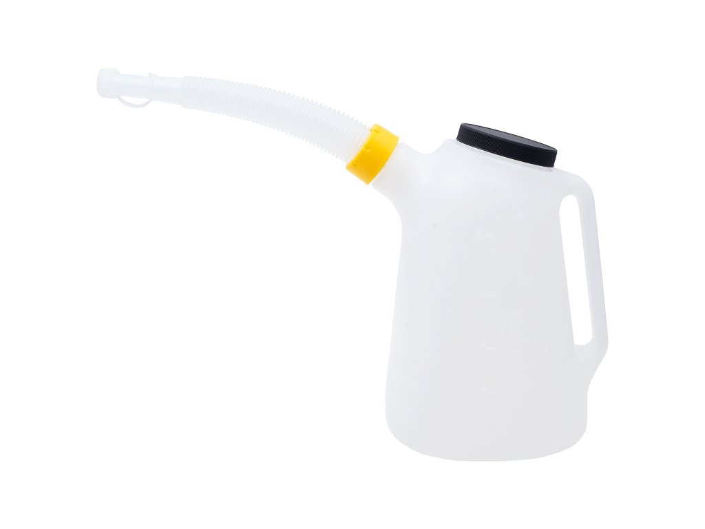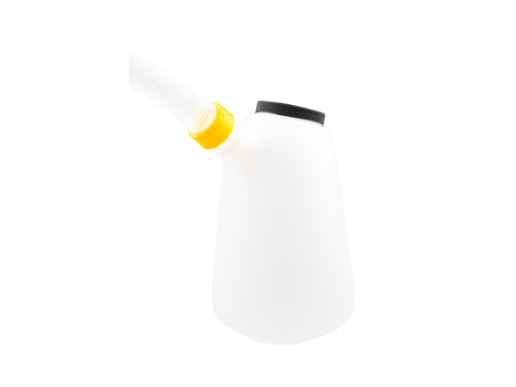 Polyetylénová kanva / nádoba na olej a iné kvapaliny opatrená ochranným viečkom proti nečistotám a flexibilným výtokom sa zátkou zabraňujúci rozliatiu.