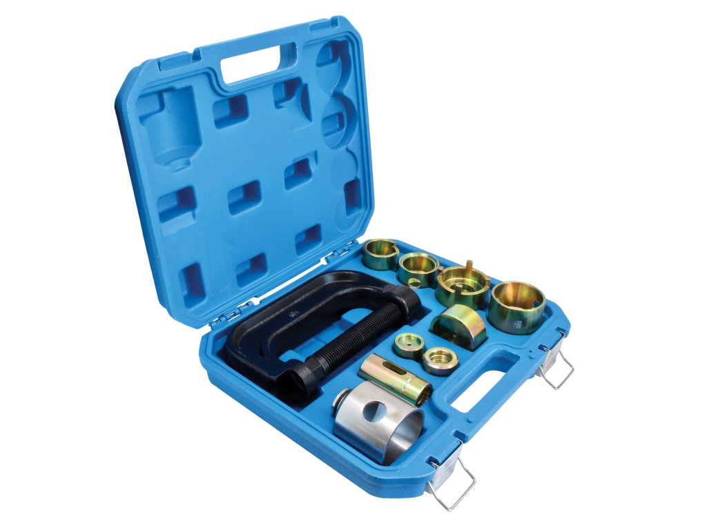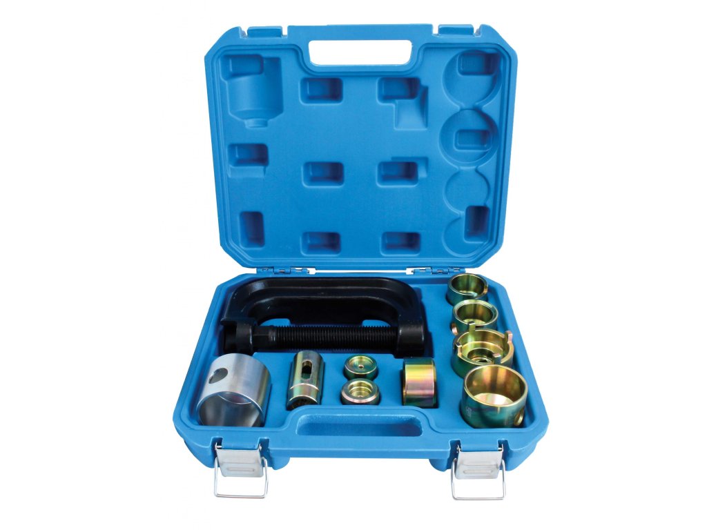 10-dielna súprava na demontáž a montáž spodných guľových kĺbov Mercedes-Benz špeciálne navrhnutá na použitie na mieste na demontáž alebo montáž predných a zadných puzdier a guľových kĺbov bez demontáže tlmičov, pomocných rámov, priečnikov alebo vlečných ramien.