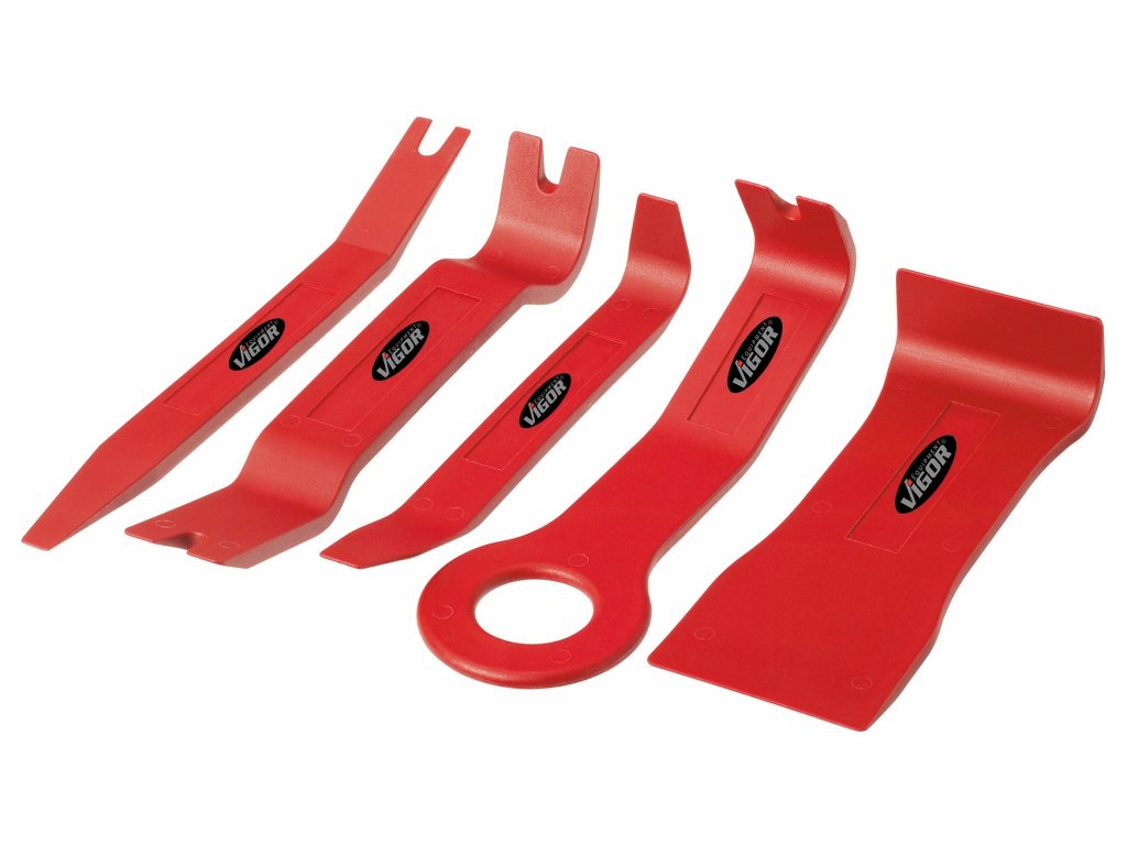 5-dielna sada špeciálnych prípravkov VIGOR V1369 vysokej kvality (dcérska firma HAZET / Germany) sa používa pre demontáž plastových príchytiek čalúnenia vozidiel, pre šetrnú demontáž ozdobných líšt, plastových dielov (vetracích mriežok a pod.) Bez poškriabaniu nadväzujúcich plôch.
