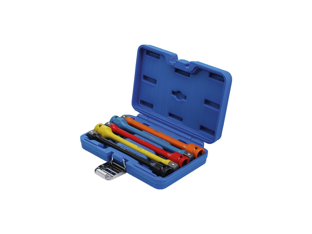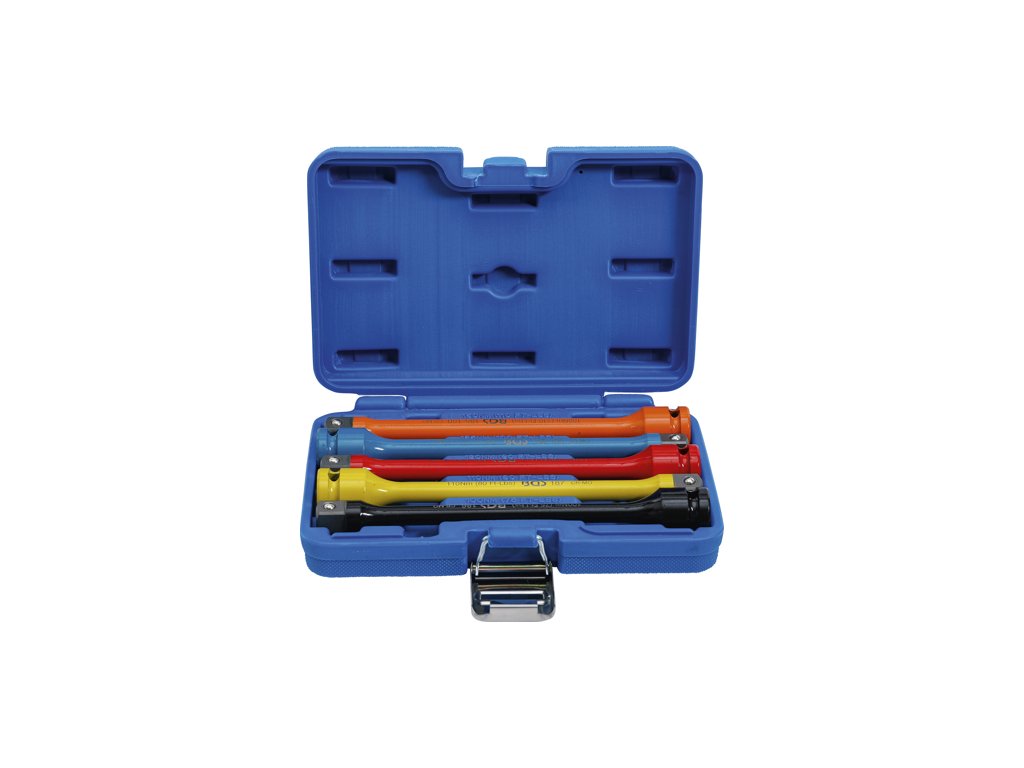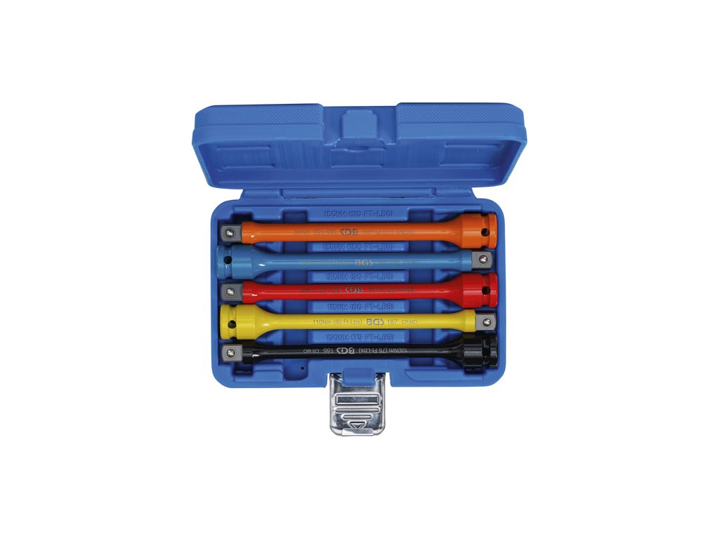 Momentové nadstavce - nadstavec, 4 hrany 1/2" vodiaceho prvku, pre krútiace momenty 100-150 Nm, jednotná dĺžka 195 mm, sada 5 kusov v plastovej kazete - BGS technic 185