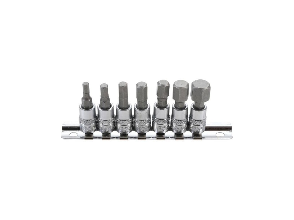 Zástrčné skrutkovačové hlavice profilu Imbus (6hrán), vodiaci 4hran 1/4“ (6,3 mm), súprava 6 kusov na lište (tzv. koľajnici) – BGS technic 2161