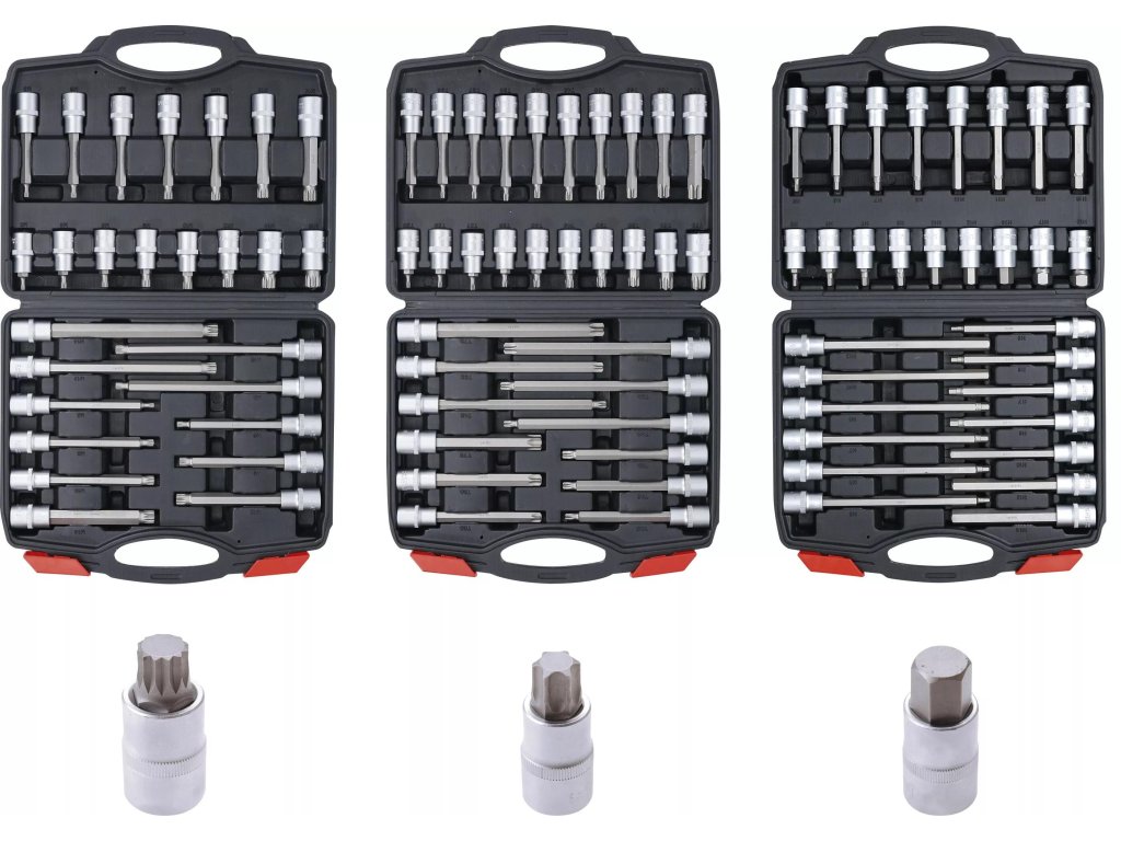 Prakticky zostavená sada tzv. zástrčiek pre garáž, dielňu a domáceho hobby používateľa. Obsahuje zásuvky všetkých často používaných profilov vo veľkom rozsahu veľkostí a dĺžok.