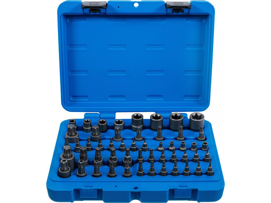 Bity a nástrčné hlavice, tzv. profilové hlavice TORX, TORX E, TORX Tampered a TORX Plus, 1/4", 3/8" a 1/2" vodiaci štvorhran, sada 52 dielov v plastovom kufríku - BGS technic 9839
