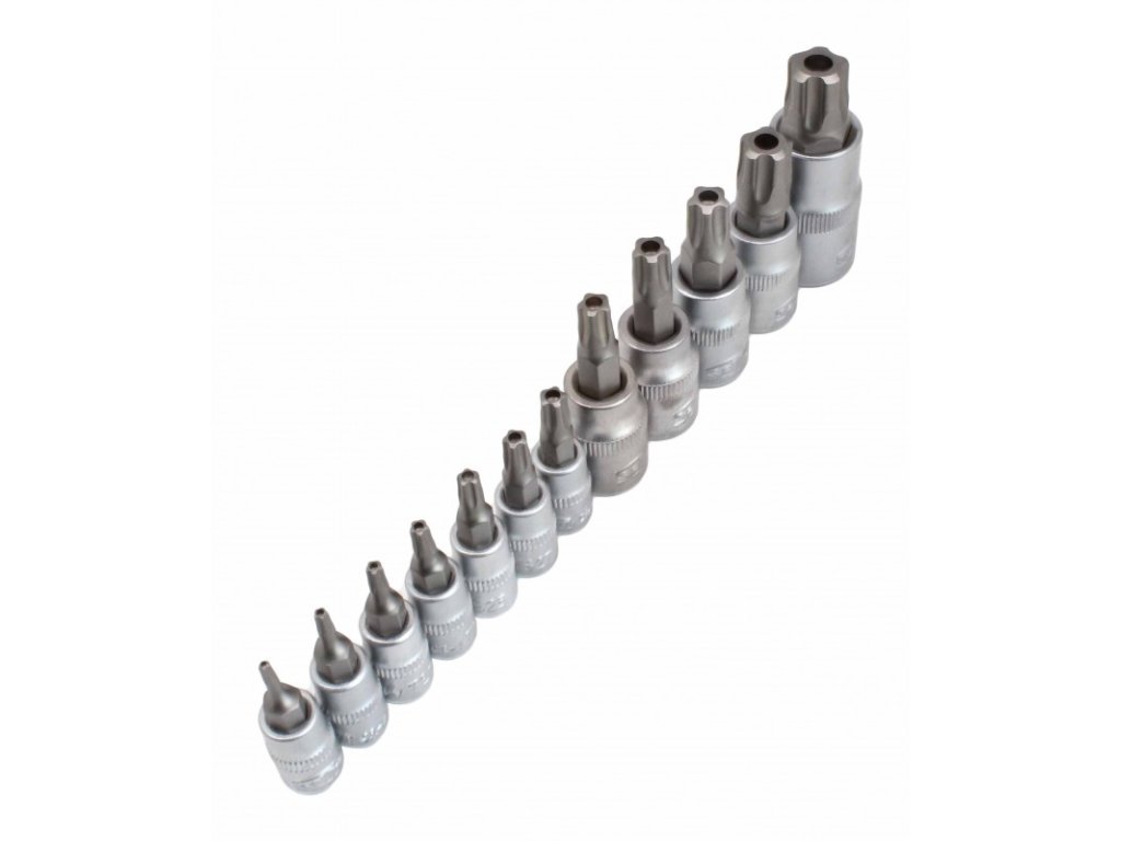 Zástrčné hlavice TORX-TS s otvorom 1/4", 3/8" a 1/2", TS8-TS60, súprava 12 ks - SATRA