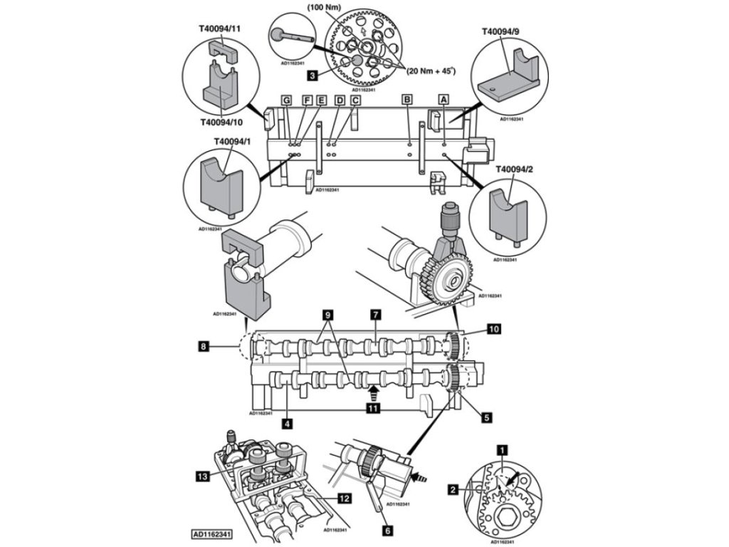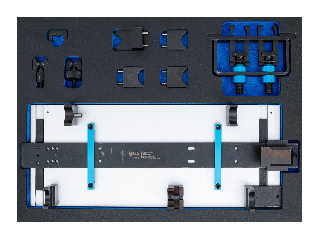 Obsahuje nasledujúce nástroje: Montážny prípravok ako OEM T40094. Aretačný prípravok vačkové hriadele OEM T40095. 2x svorky ako OEM T40096 a T40096 / 1.4x aretačná prípravok vačkového hriadeľa ako OEM T40094 / 1, T40094 / 2, T40094 / 9, T40094 / 10. Aretačný prípravok vačkového hriadeľa OEM T40094 / 11.