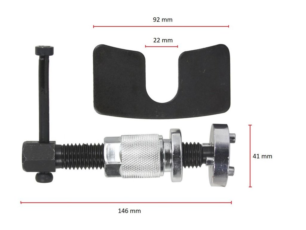 Nástroj na stlačenie a zaskrutkovanie brzdových piestkov v strmeňoch so zakomponovanou ručnou brzdou, dve rozstupy 28 a 38 mm.