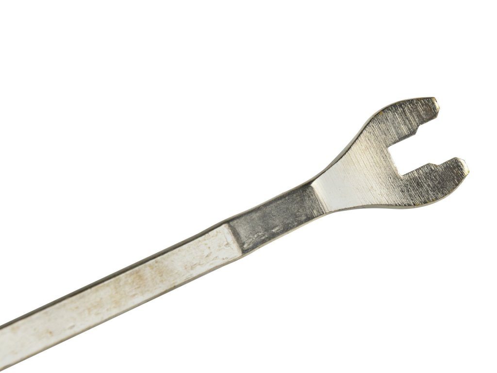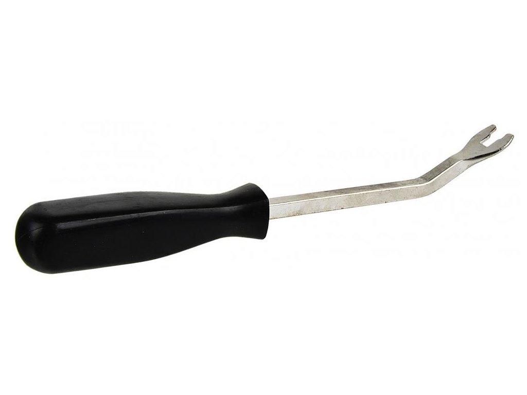 Špeciálny nástroj pre ľahkú demontáž plastových príchytiek dverného čalúnenie tvorí rukoväť a kovová časť s koncovým rozvidlením Lyžicový formy.