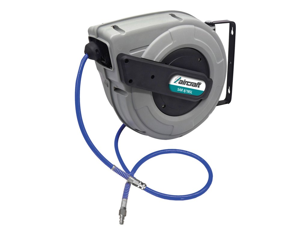 Navíjací bubon s polyuretánovou hadicou v dĺžke 18 ms rýchlospojkou a vsuvkou DN 7,4 as integrovanou brzdou regulujúcou rýchlosť navíjania hadice späť do bubna. Na montáž na stenu alebo strop.