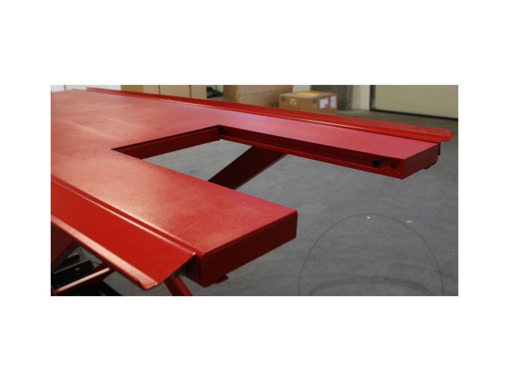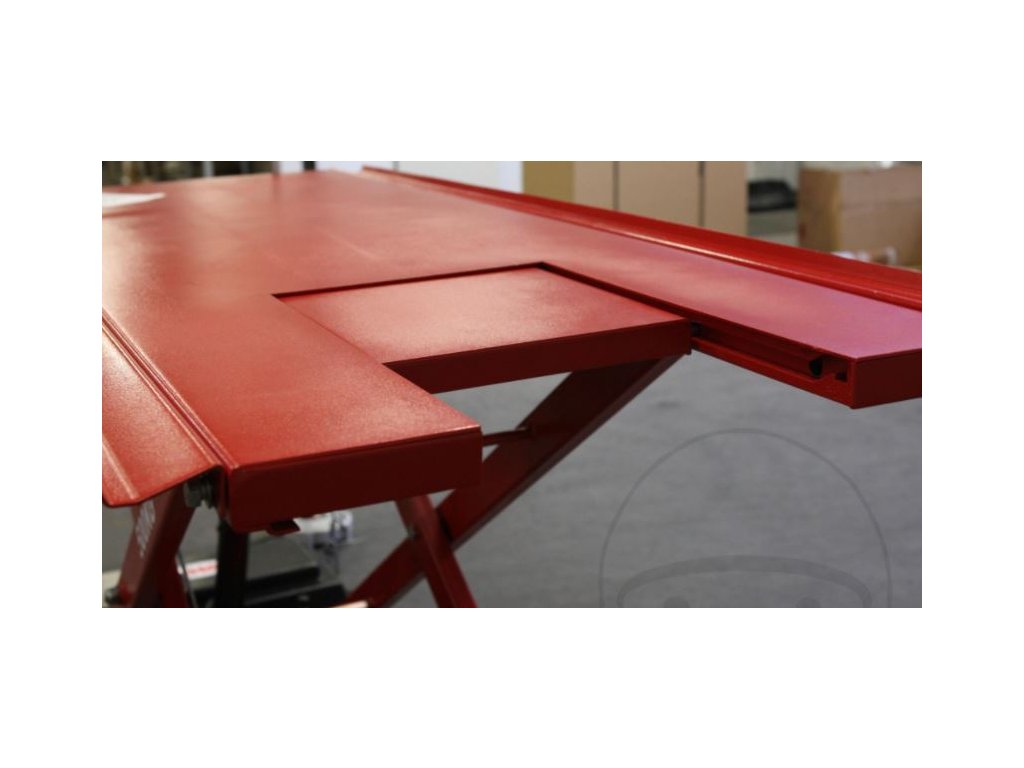 Pracovná plocha s rozmermi 210 x 75 cm plne postačuje na drvivú väčšinu štandardných servisných úkonov, potrebné náradie možno položiť do odkladacích žliabkov na pozdĺžnych stranách. Vďaka integrovanej závesné bráne možno zdvihák využiť aj na výmenu kolies.