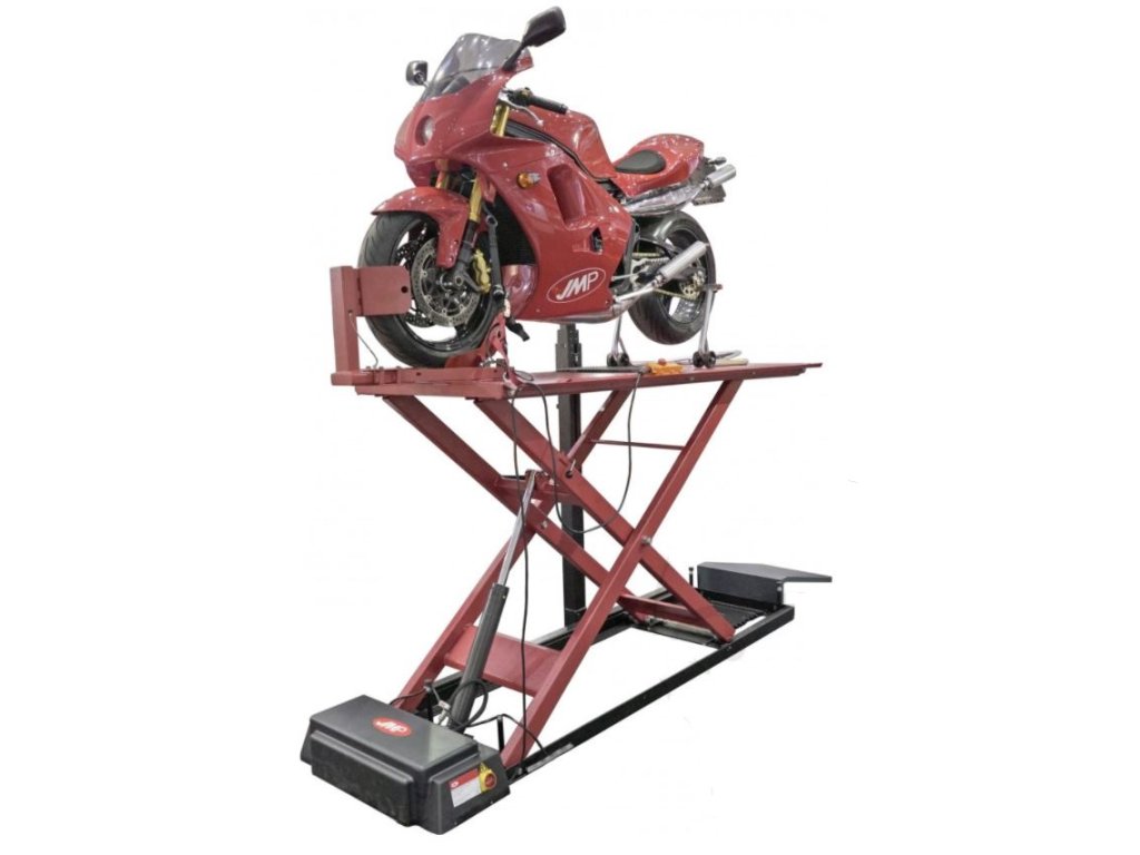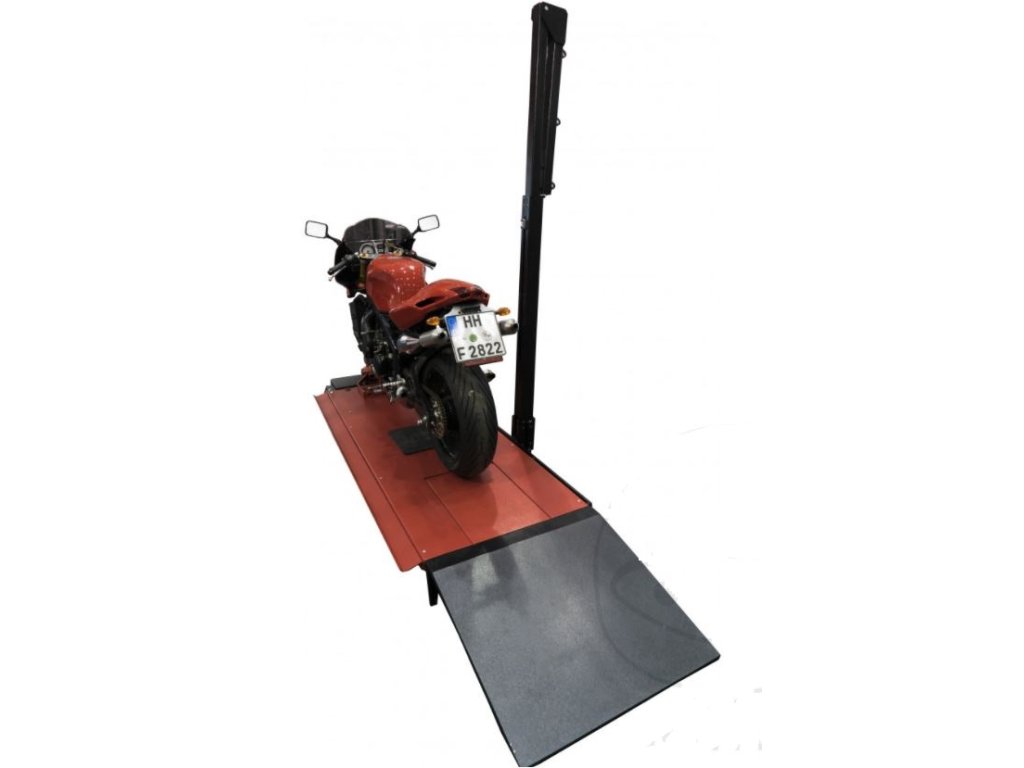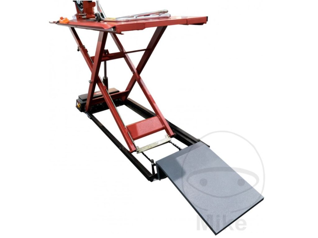 Plošinový zdvihák s nožnicovým mechanizmom, určený na zdvíhanie všetkých typov motocyklov - od skútrov po ťažšie stroje (Honda Gold Wing, Harley-Davidson Road Glide pod.).