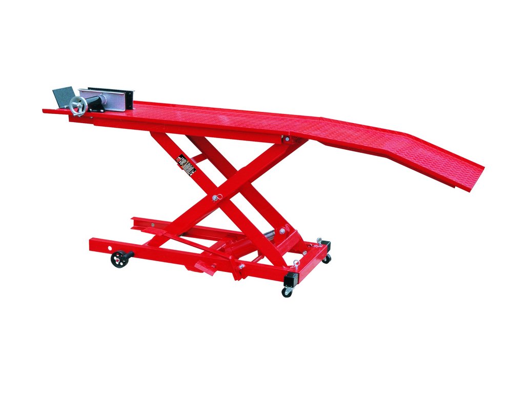 Moto zdvihák určený k opravám a údržbe strojov. Prístup na pracovnú plošinu umožňuje nájazdová rampa, stabilitu motorky zaisťuje upínací element, do ktorého sa upevní predné koleso.