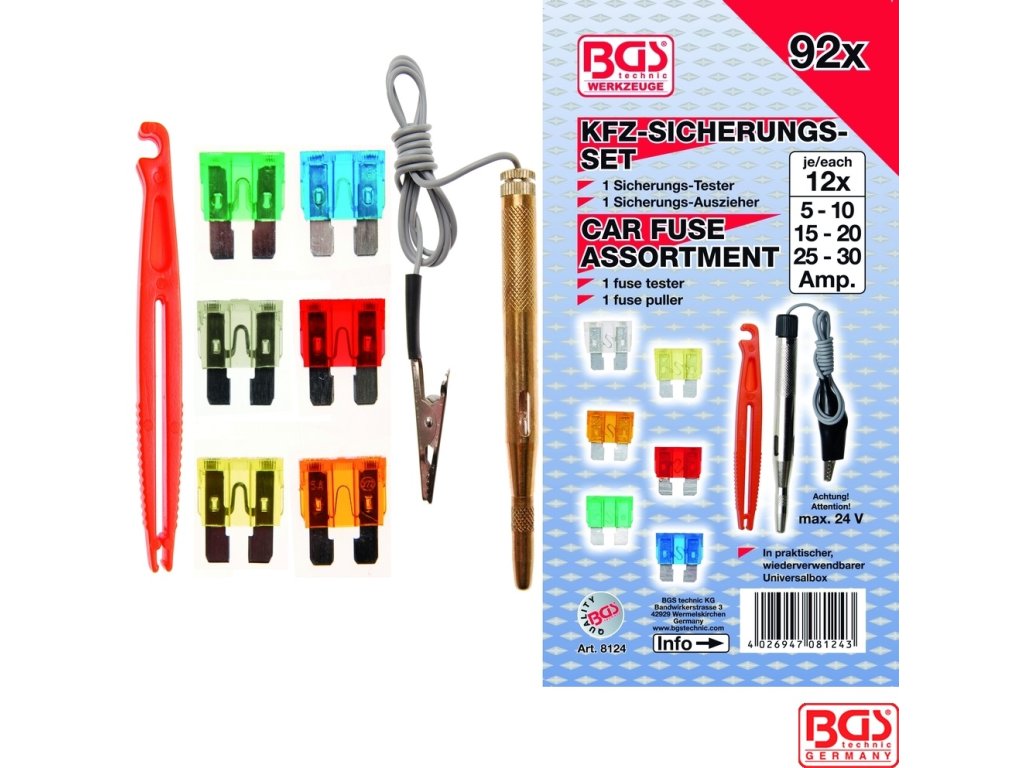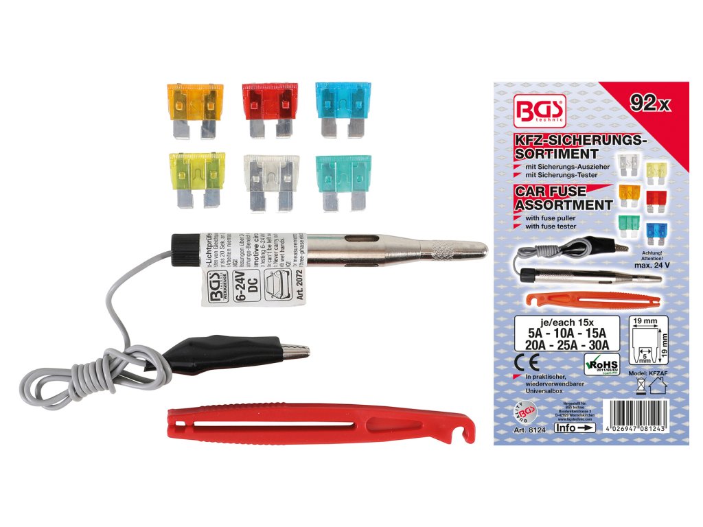 Poistky nožové 5-30 A + Skúšačka 6-24V 92 dielov - BGS 8124