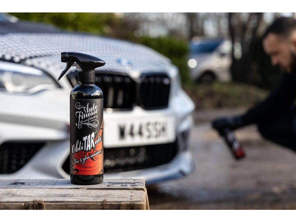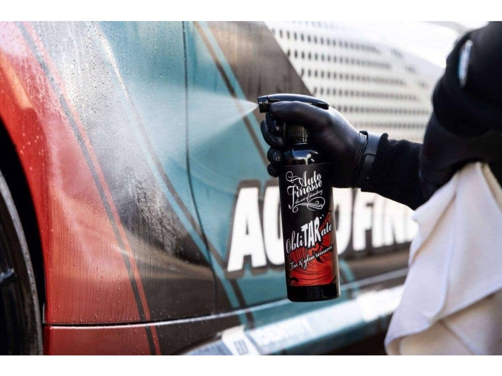 Auto Finesse® ObliTARate je čistiaci prostriedok na báze rozpúšťadiel, ktorý rýchlo rozpúšťa odolné zvyšky dechtu a lepidla a znečistenie pri kontakte, ešte predtým, ako sa dotknete svojho vozidla. Tým sa minimalizuje riziko poškriabania a znehodnotenia lakovaného povrchu a zároveň sa predlžuje životnosť vášho detailingového prípravku na báze hliny. Auto Finesse® ObliTARate dokáže rozpustiť aj tie najextrémnejšie znečistenia, ako sú stopy po dopravných kužeľoch z automobilových závodov, lepiace pásky z dočasných držiakov kamier, prestriekaný podvozok a zvyšky ochranného vosku z výroby. ObliTARate je bezpečný na použitie na všetkých moderných lakovaných a práškovo lakovaných povrchoch, skle, odolných tvrdých plastoch, holom kovu a lesklých ozdobných lištách. Je však veľmi silný a môže poškodiť čerstvý lak, opravy SMART, nekatalyzované laky a niektoré jemné historické povrchy. Pri použití na týchto povrchoch buďte opatrní a najprv ho vyskúšajte na nenápadných miestach. Pokiaľ sa na povrchu nevyskytuje žiadna hmla alebo napučanie a lak sa neprenáša na aplikátor alebo handričku z mikrovlákna, môžete ObliTARate bez obáv používať.