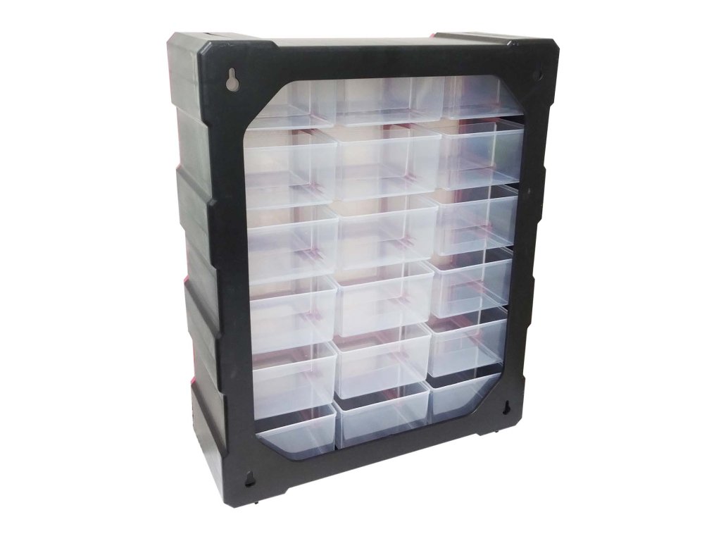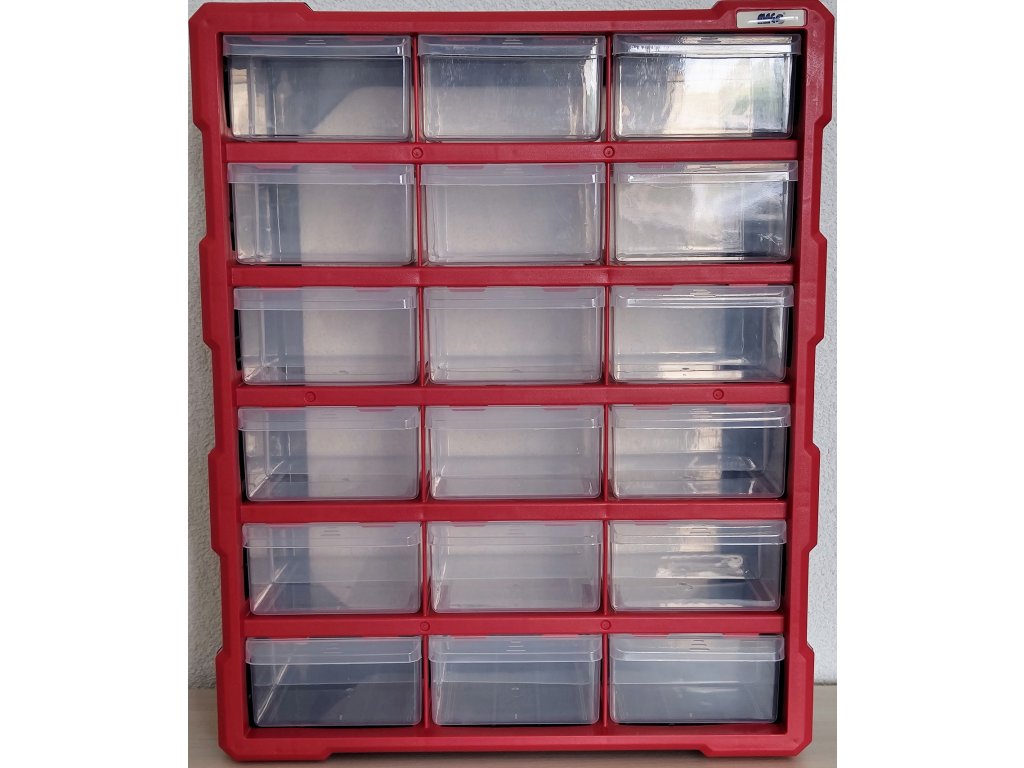 Skriňa s 18 zásuvkami z plastu je nevyhnutnou možnosťou úložného priestoru pre vašu dielňu. Je ideálna na ukladanie drobných predmetov, ako sú vrtáky, skrutky, klince, matice, podložky, kliešte, skrutkovače a mnoho ďalšieho. Skrinka je vyrobená z odolného plastu. Vďaka priehľadným zásuvkám budete mať vždy prehľad o uložených predmetoch.