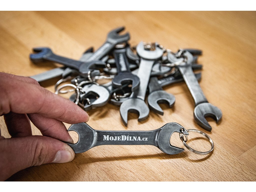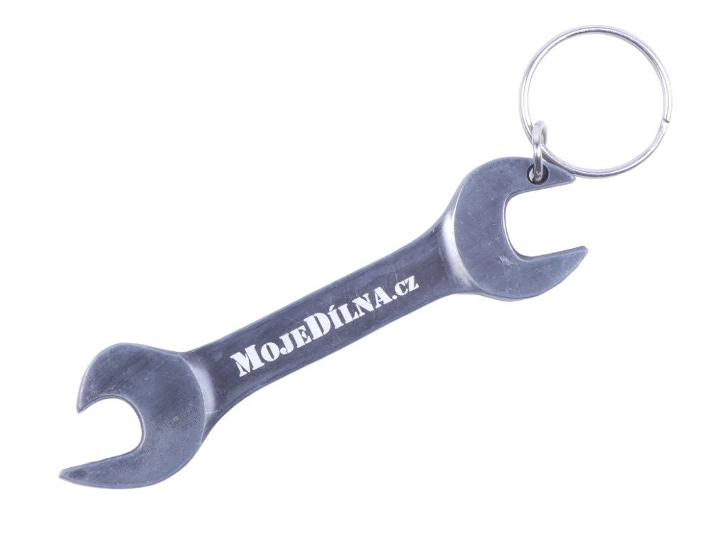 Otvárač na fľaše v tvare kľúča, s logom MojeDílna.cz, s krúžkom na zavesenie.