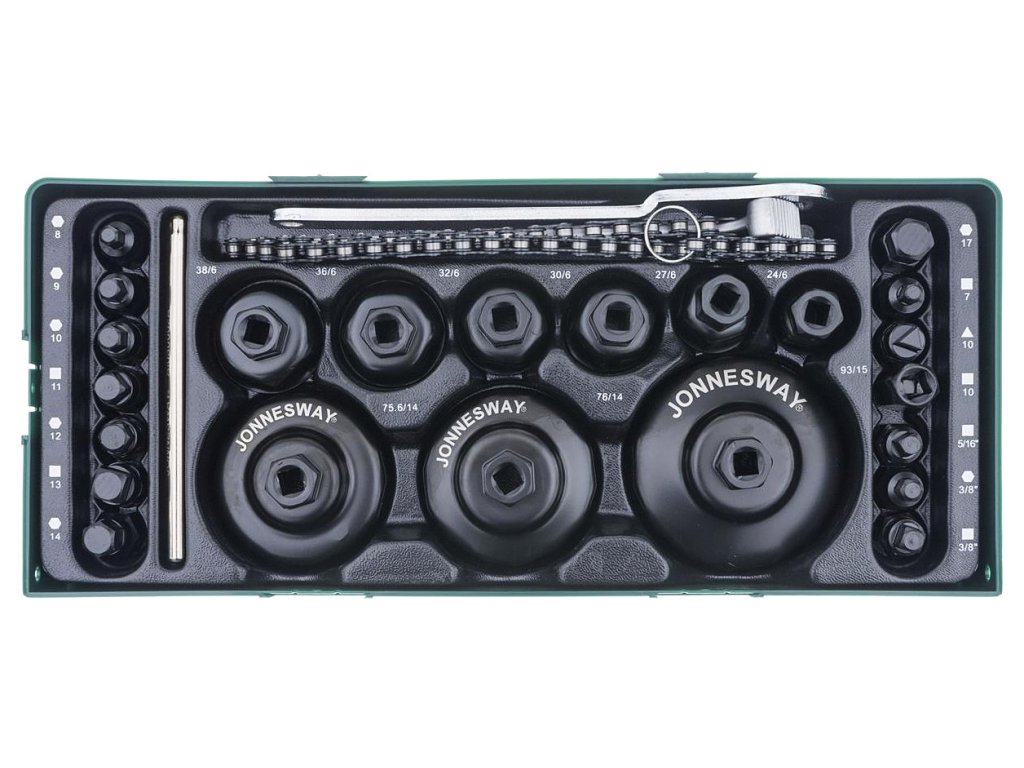Komplexné súprava miskovitých kľúčov a reťazového kľúče na olejové filtre a hlavíc na výpustné skrutky olejových vaní.