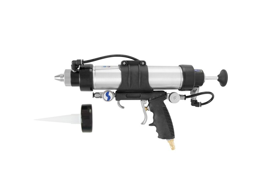 Profesionálna pneumatická striekacia a vytláčacia pištoľ na aplikáciu striekaných, tesniacich, tmeliacich a lepiacich materiálov v rôznych kazetách a fóliových/salamových vreckách (silikón, akryl, polyuretán a iné materiály). Týmto spôsobom je možné okrem iného utesňovať zvary, rôzne medzery, vytvárať tzv. húsenice zhodné s prvovýrobou, nanášať lepidlo pri montáži/lepení skla, nanášať rôzne materiály v oblasti sanitárnej techniky, vykonávať nástreky s rôznou štruktúrou/textúrou (hrubšie perličky, stredne zvrásnené, jemnejšie nástreky atď.), čím sa obnovuje pôvodná povrchová úprava napr. karosérií automobilov. Pomocou tejto pištole možno striekať aj spodnú časť vozidiel. Je vybavená systémom na zabránenie rozliatiu/odkvapkaniu materiálu po ukončení pracovného procesu. Nie je vhodná na lepidlá s vysokou viskozitou.