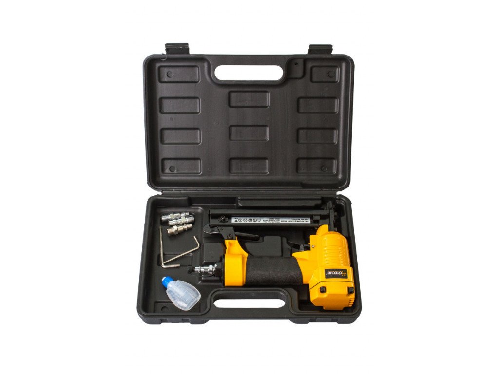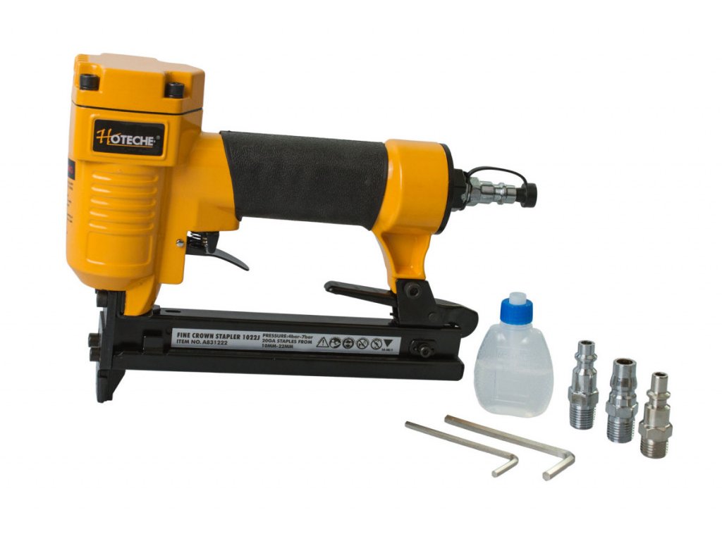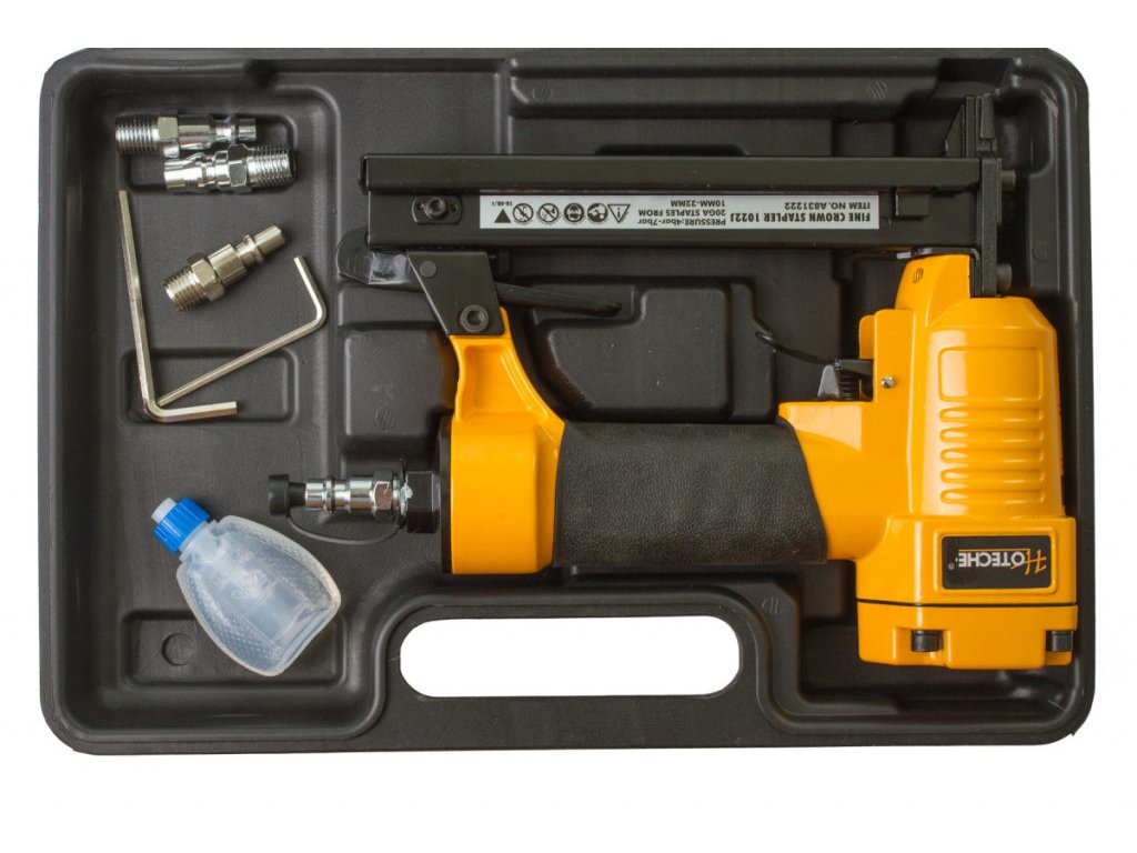 Pneumatická nastreľovacia pištoľ na sponky (sponkovačka), pre spony dĺžky 10-22 mm a šírky 11,2 mm, sada s príslušenstvom v kufríku – Hoteche