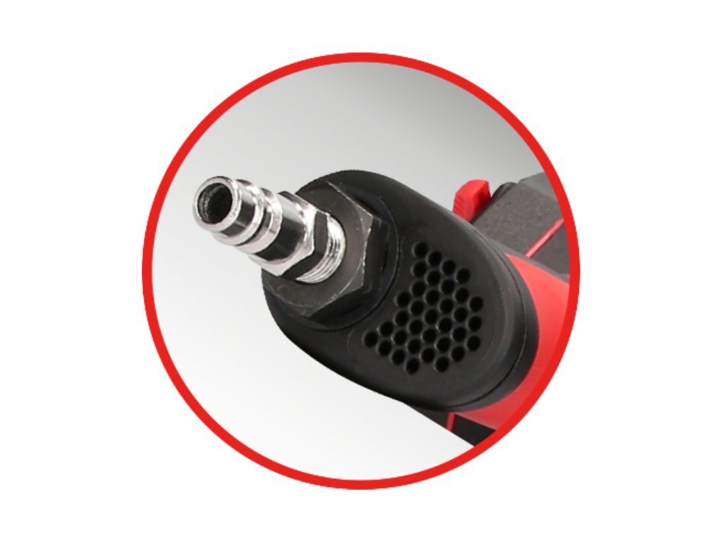 Navrhnuté s ohľadom na pohodlnú obsluhu: chod sa spúšťa dobre prístupným tlačidlom, smer otáčania sa prepína pákou na zadnej strane náradia. Prívod tlakového vzduchu je zospodu rukoväte, takže pri práci neprekáža. Rukoväť je ergonomicky tvarovaná a má protišmykovú povrchovú úpravu. Vďaka ultralehkému hliníkovému plášťu a nízkej váhe iba 2,1 kg uťahovák nezaťažuje ruky toľko ako štandardné varianty.