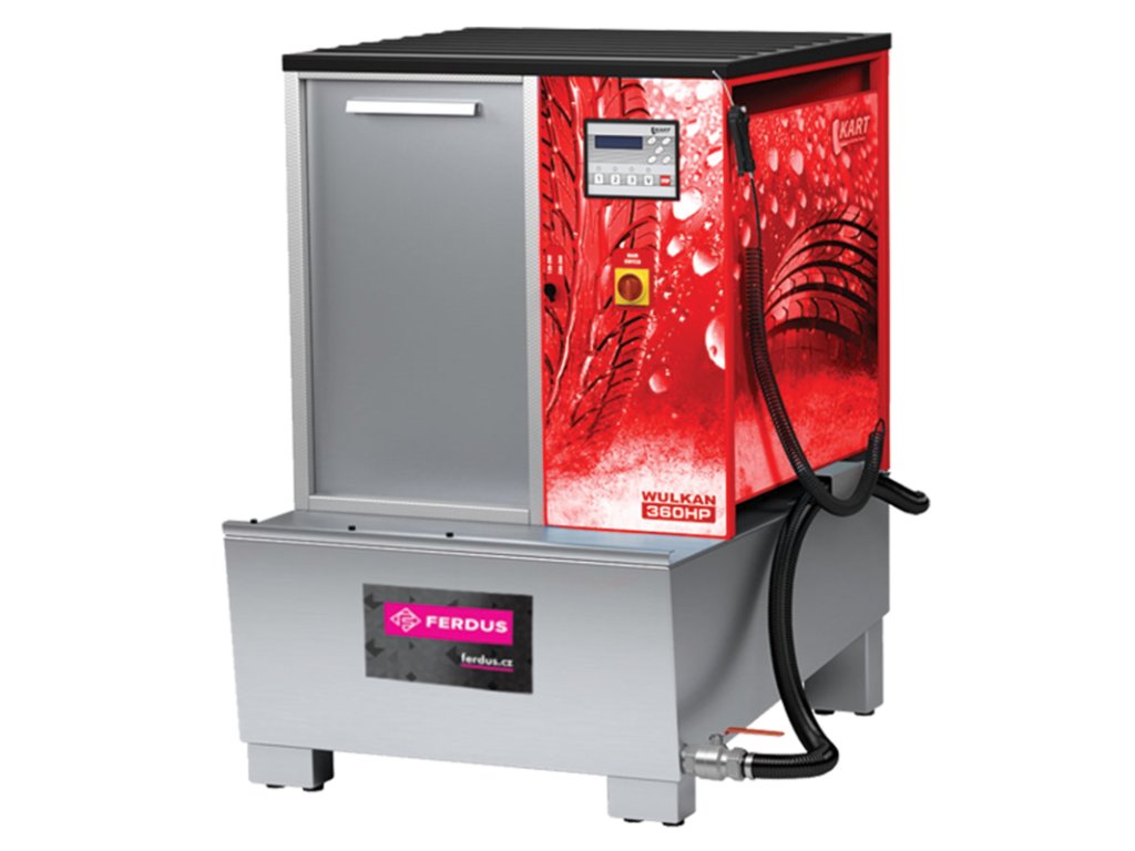 Umývací stroj – umývačka na kolesá WULKAN 360HP pre menšie aj väčšie vozidlá, so systémom ohrevu vody a jednotkou pre pneumatickú stabilizáciu kolesa – Ferdus 24.05