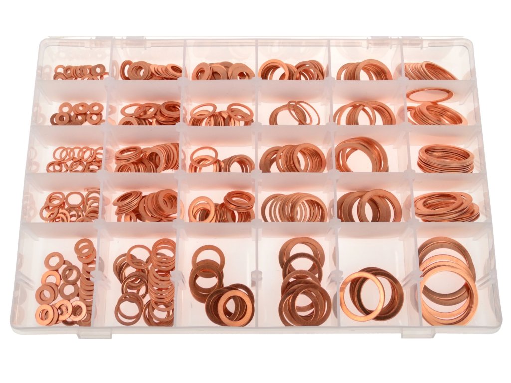 Podložky medené, ploché, rôzne priemery, sada 580 kusov