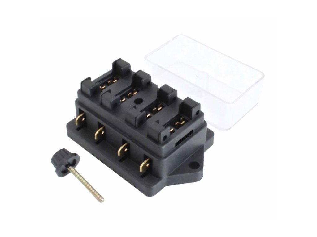 Poistková skrinka pre montáž do elektroinštalácie vozidiel so štyrmi miestami. Ľahká kontrola poistiek vďaka priehľadnému prekryte - pri prezeraní netreba jeho demontáže. Veko sa ľahko a rýchlo zaisťuje pomocou skrutky.