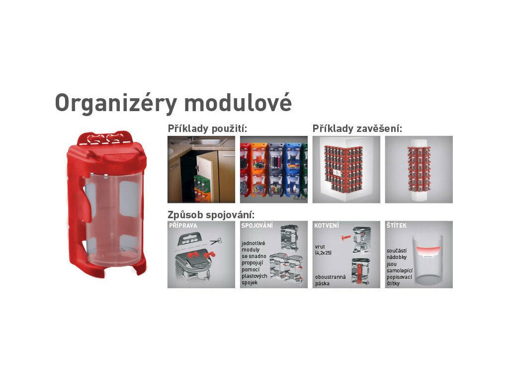 - Prenosný organizér pre samostatné použitie alebo ako doplnok k závesným organizérom. Jednotlivé nádoby je možné z prenosného organizéra ľahko vybrať a vložiť do závesného organizéra.