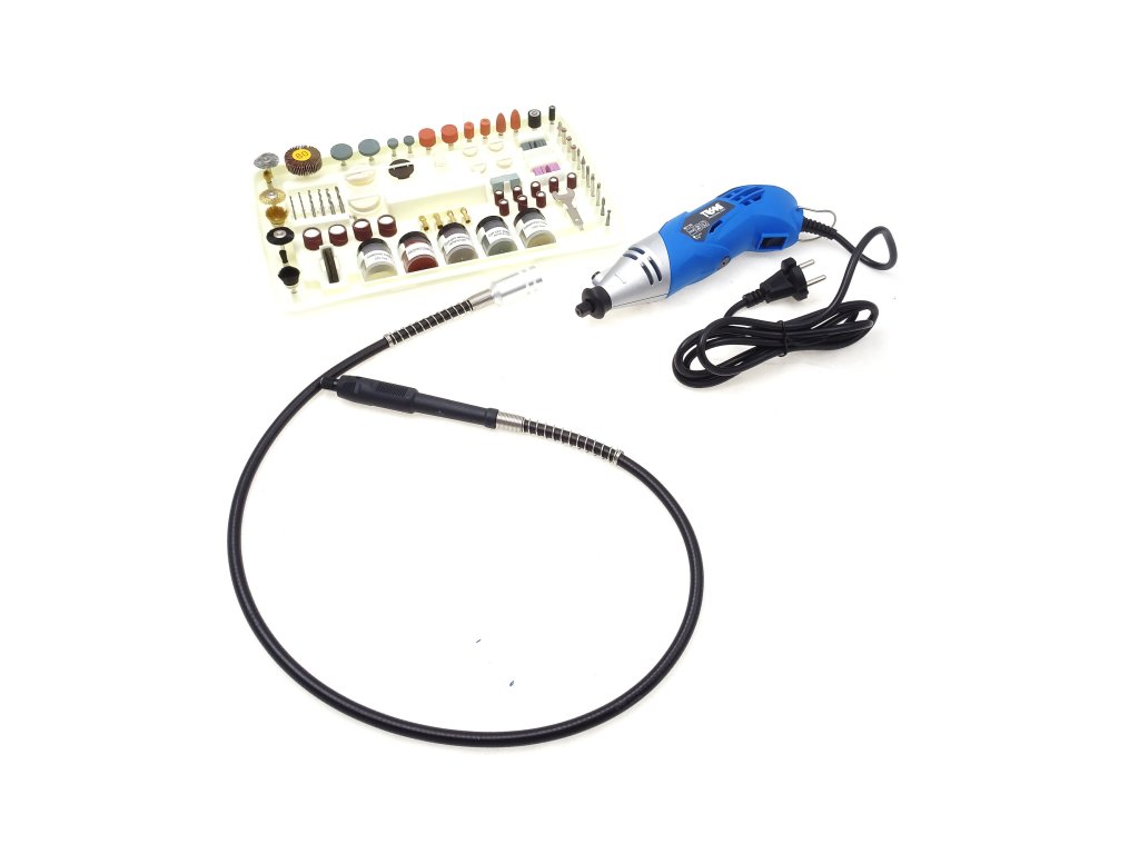 V príslušenstve flexibilné predlžovací hriadeľ a bohatá sada brúsnych a rezných nástrojov