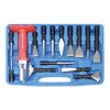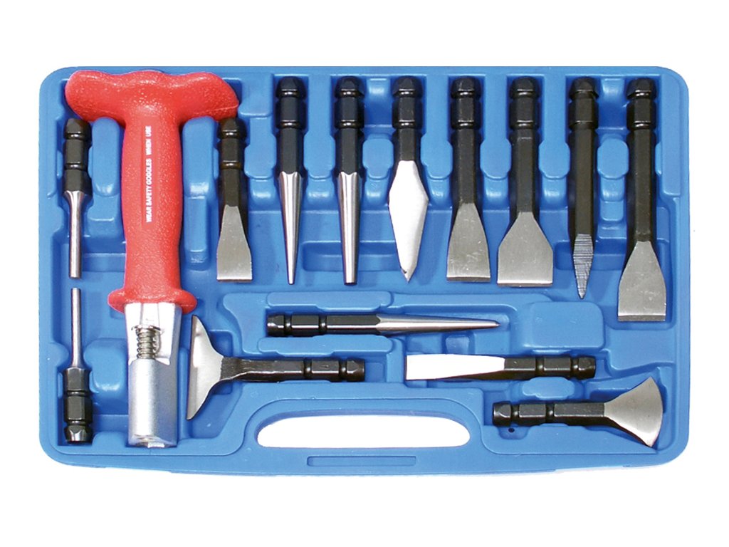 Chróm molybdén. Ergonomicky tvarovaná plastová rukoväť s protišmykovou úpravou. Rýchla výmena nástroja. Obsahuje: 1 rukoväť pre sekáče, 7x plochý sekáč, 1x krížový sekáč, 1 jamkovač, 3x vyrážač, 2x dierkovač.