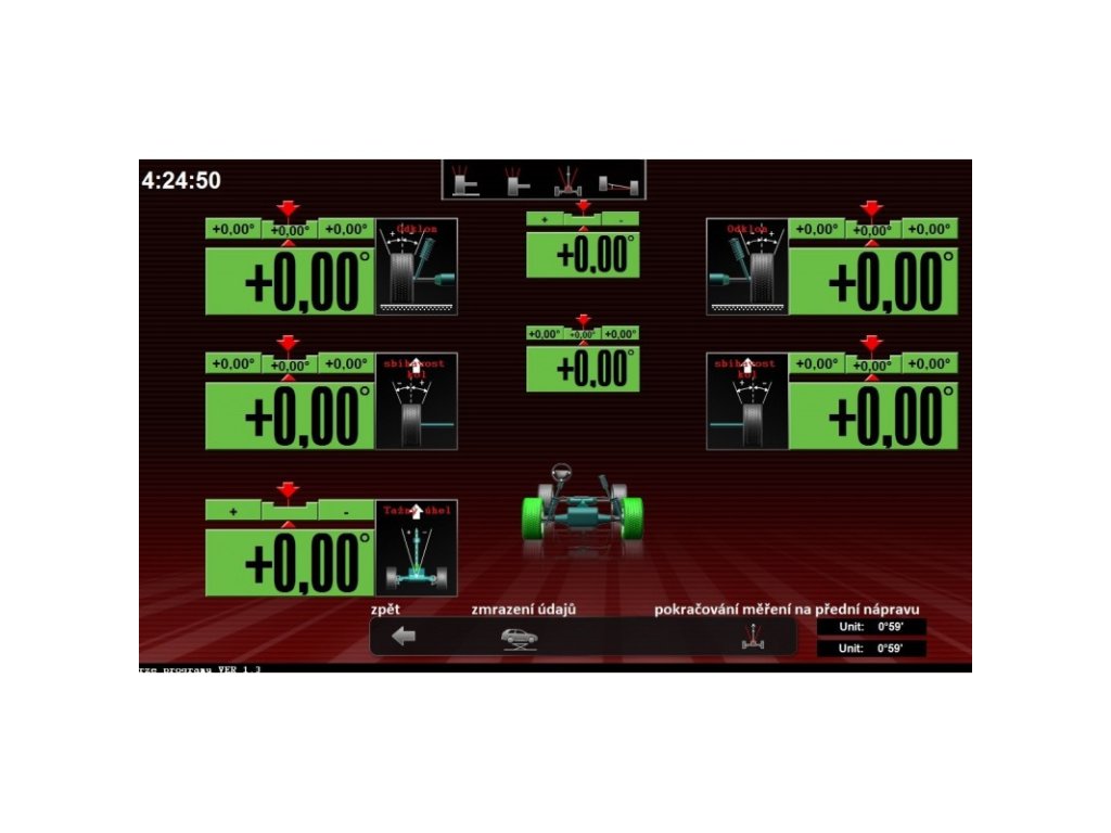 Zariadenie meria: zbiehavosť kolies, odklon, záklon a príklon, presádzanie kolies, jazdné os, diferenčné uhol osí atď. (Pozri tabuľku).