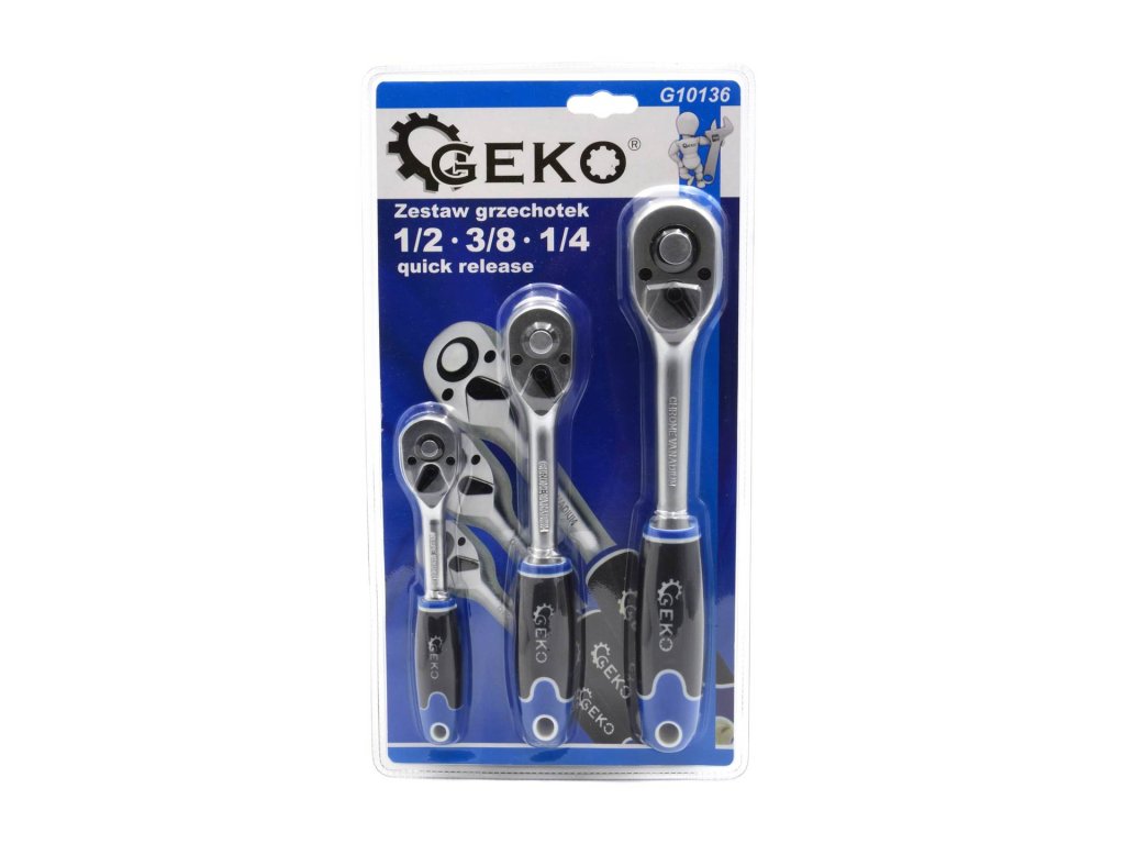 Ráčny 1/2", 3/8" a 1/4", rýchloupínacie, chróm-vanádiová oceľ, sada 3 kusov, v plastovom obale - GEKO G10136.