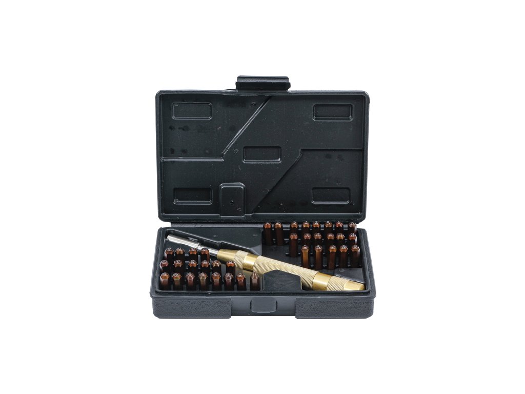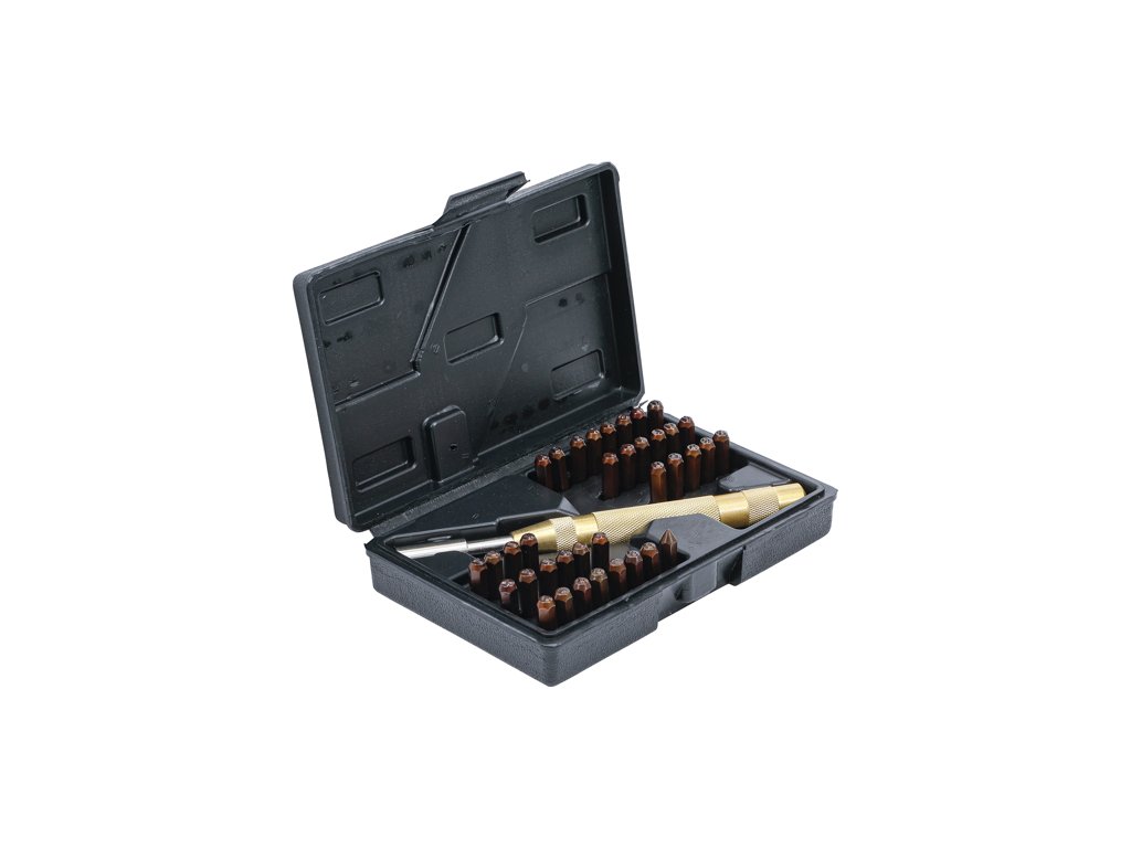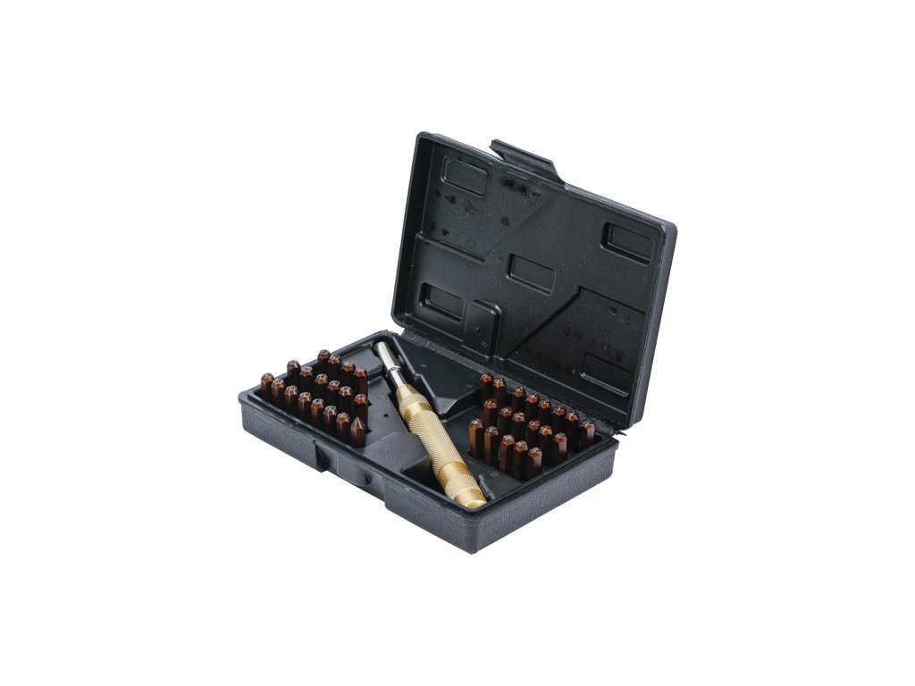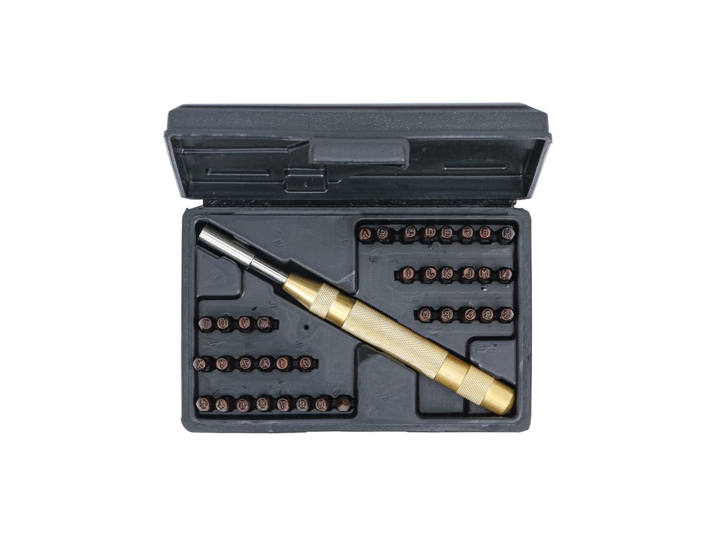 Vysoko praktická súprava pečiatok bez potreby kladiva. Obsahuje všetky základné písmená A-Z a číslice 0-9 a držiak. Používa sa napríklad na označovanie dielov automobilov alebo motocyklov, označovanie nástrojov v dielňach atď.