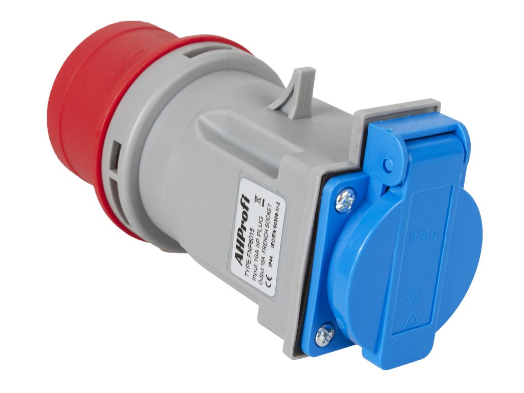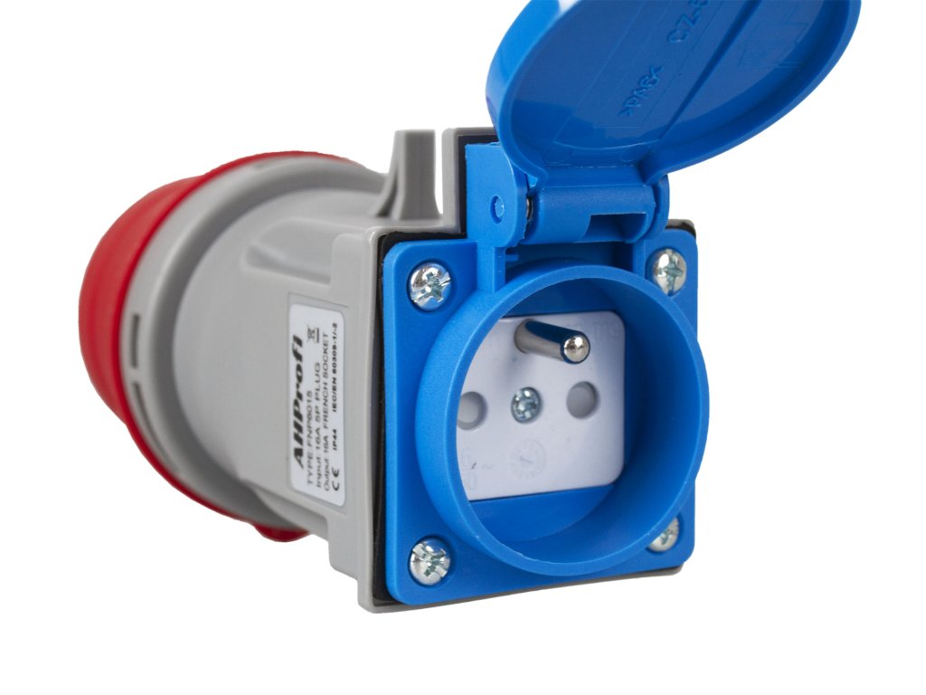 Adaptér - redukcia do zásuvky z napätia 380 V na štandard 230 V, vysoký stupeň krytia IP44 - vodeodolné, pre vonkajšie použitie.