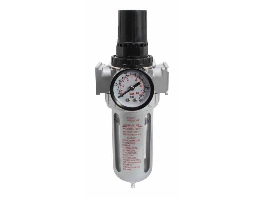 Kombinovaný regulátor stlačeného vzduchu s odlučovačom vody, pre pneumatické náradie - SATRA S-FR817 Určený na montáž na vedenie stlačeného vzduchu medzi kompresor a náradie. Vysušuje stlačený vzduch od vlhkosti a reguluje jeho tlak. Kondenzát vody sa ľahko odvádza cez ventil v spodnej časti. Ľahko čitateľný manometer na ľahkú orientáciu. Max. tlak: 10 bar Max. teplota: 60 °C