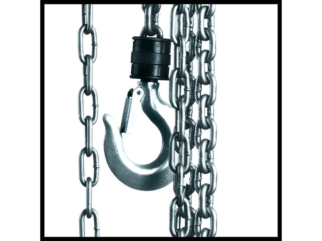 Závesný hák s bezpečnostnou poistkou, ako aj bezpečnostný hák na upevnenie na vhodný nosný prvok zabezpečuje bezpečnú prepravu bremien. Dlhá reťaz umožňuje jednoduché ovládanie reťazového kladkostroja.