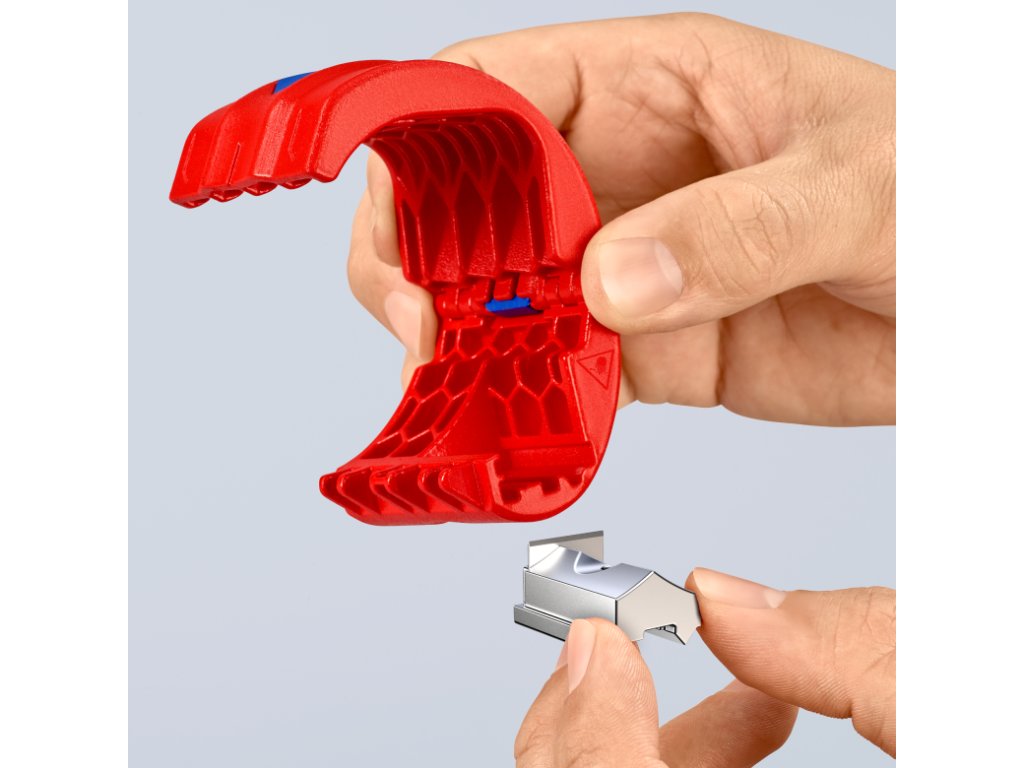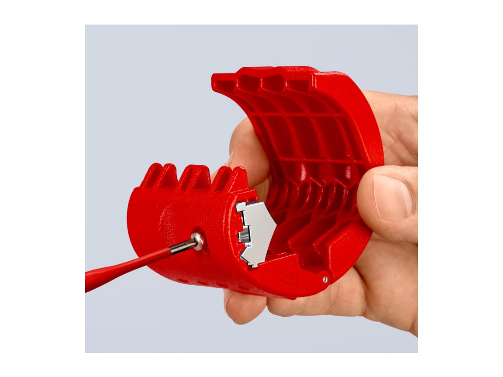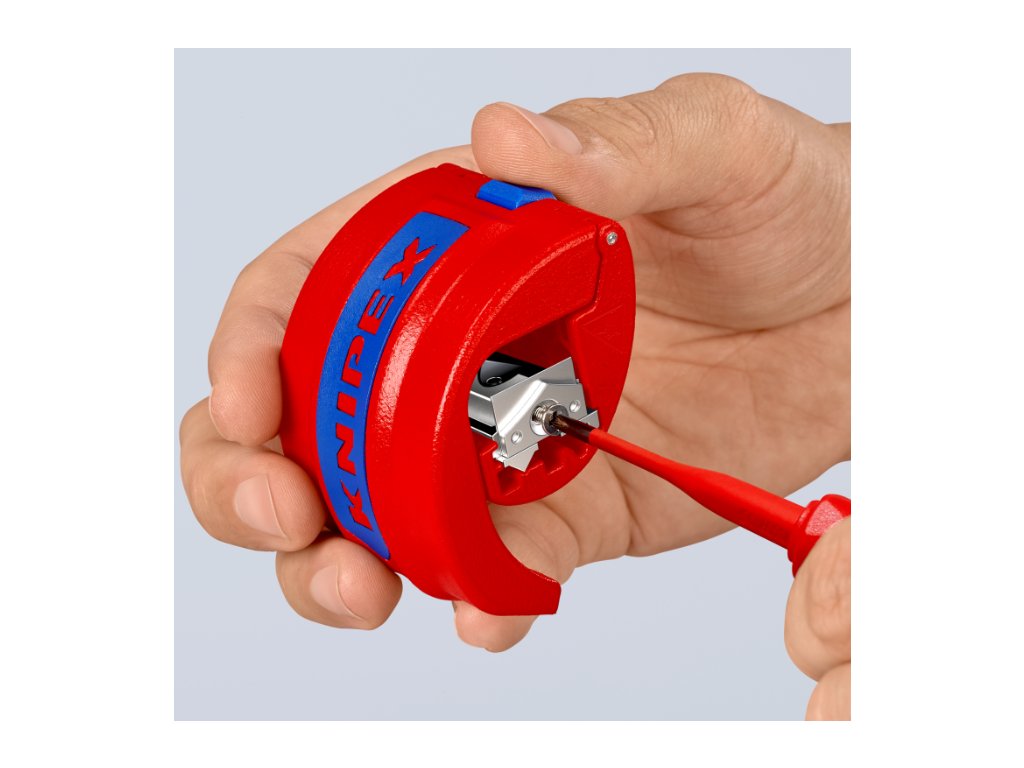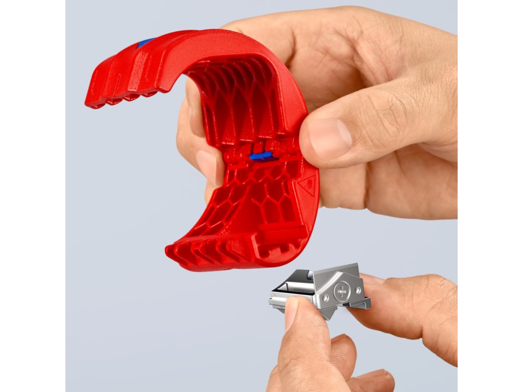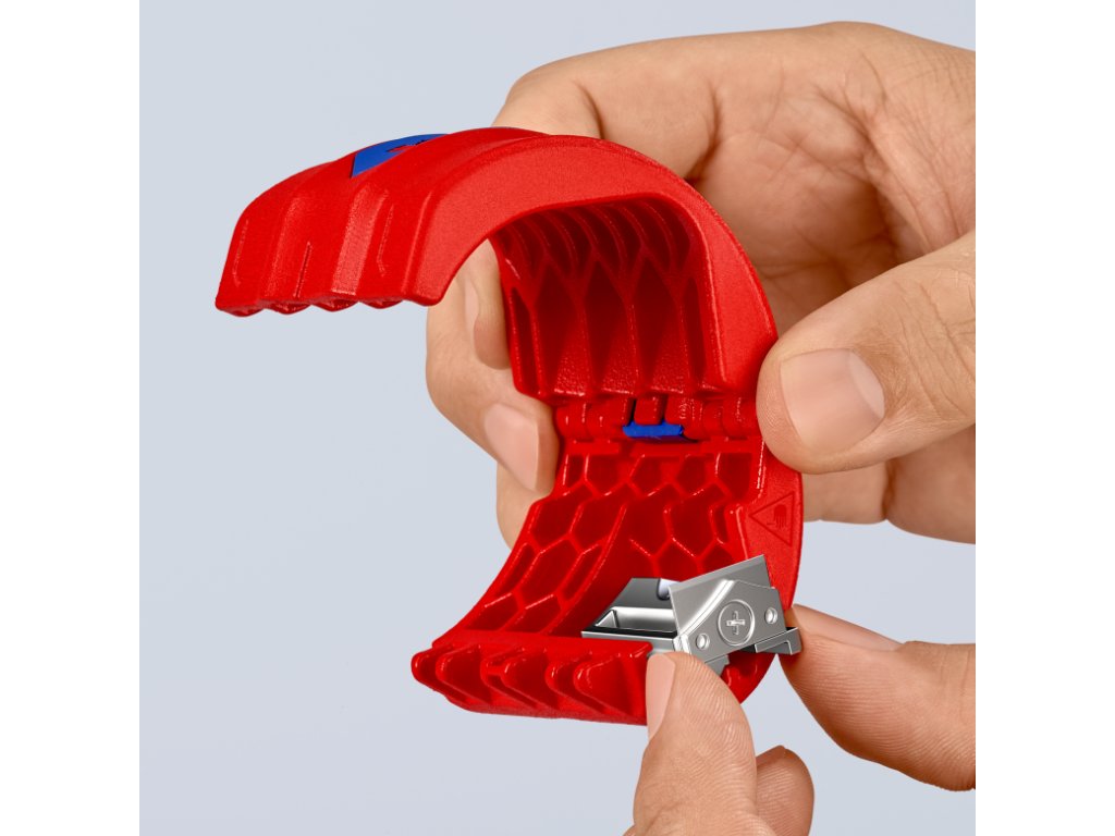 Nožový blok je otočný – na rezanie plastových trubiek (čepeľ uprostred) a tesniacich manžiet (čepeľ na okraji).